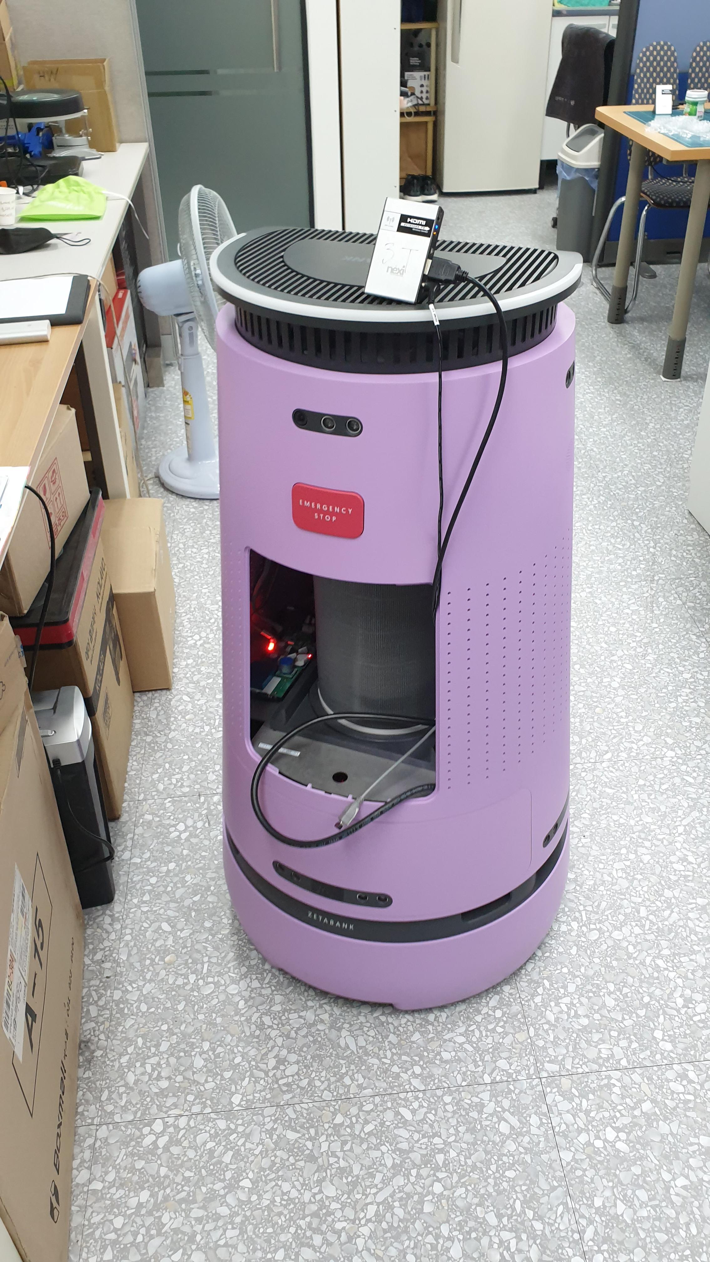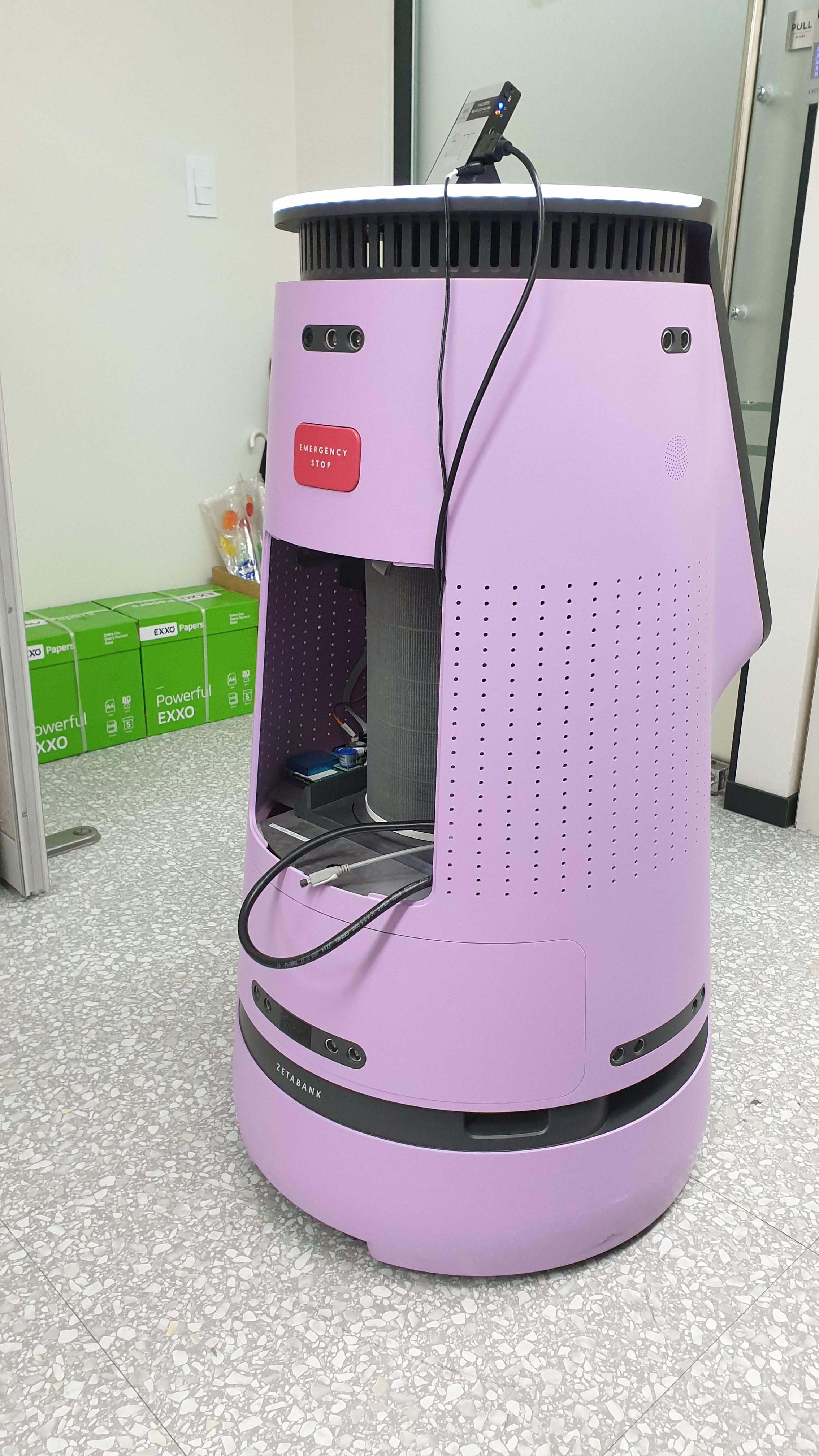 공기청정 서비스 로봇은 로봇 바닥에는 UV 램프 기반의 살균 장치가 탑재되어 바닥 및 주변 환경을 살균하며, 몸체는 공기청정기 필터를 손쉽게 교체할 수 있도록 설계되어 있습니다.