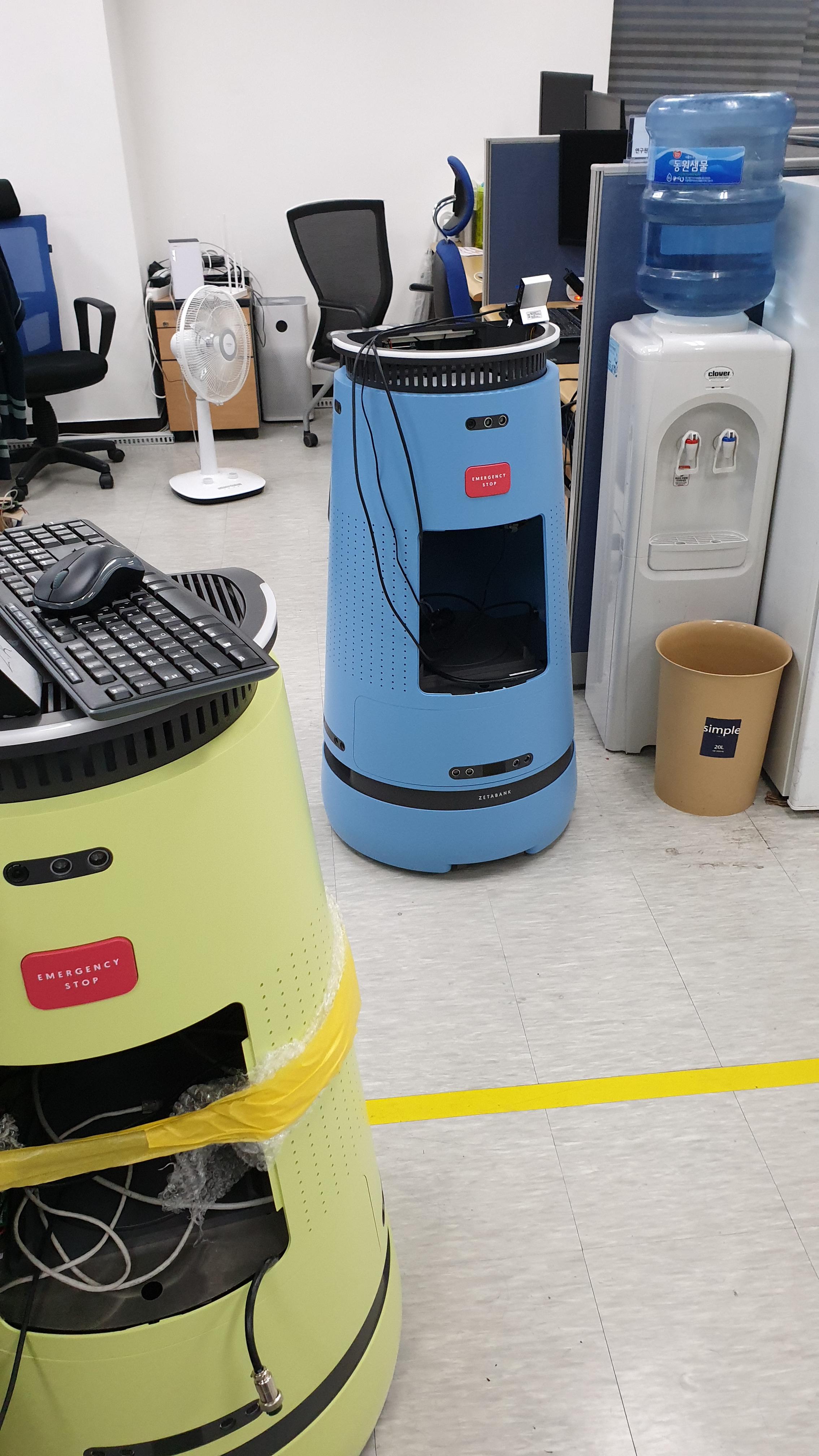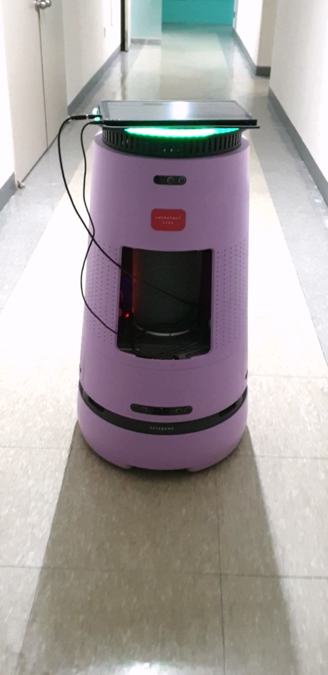 전면에 장착된 LCD는 안내 문구와 홍보 영상을 출력하는 역할을 하며, 전면 상단과 하단, 후면 상단에 부착된 RealSense 카메라는 자율주행과 거리 측정에 활용됩니다.