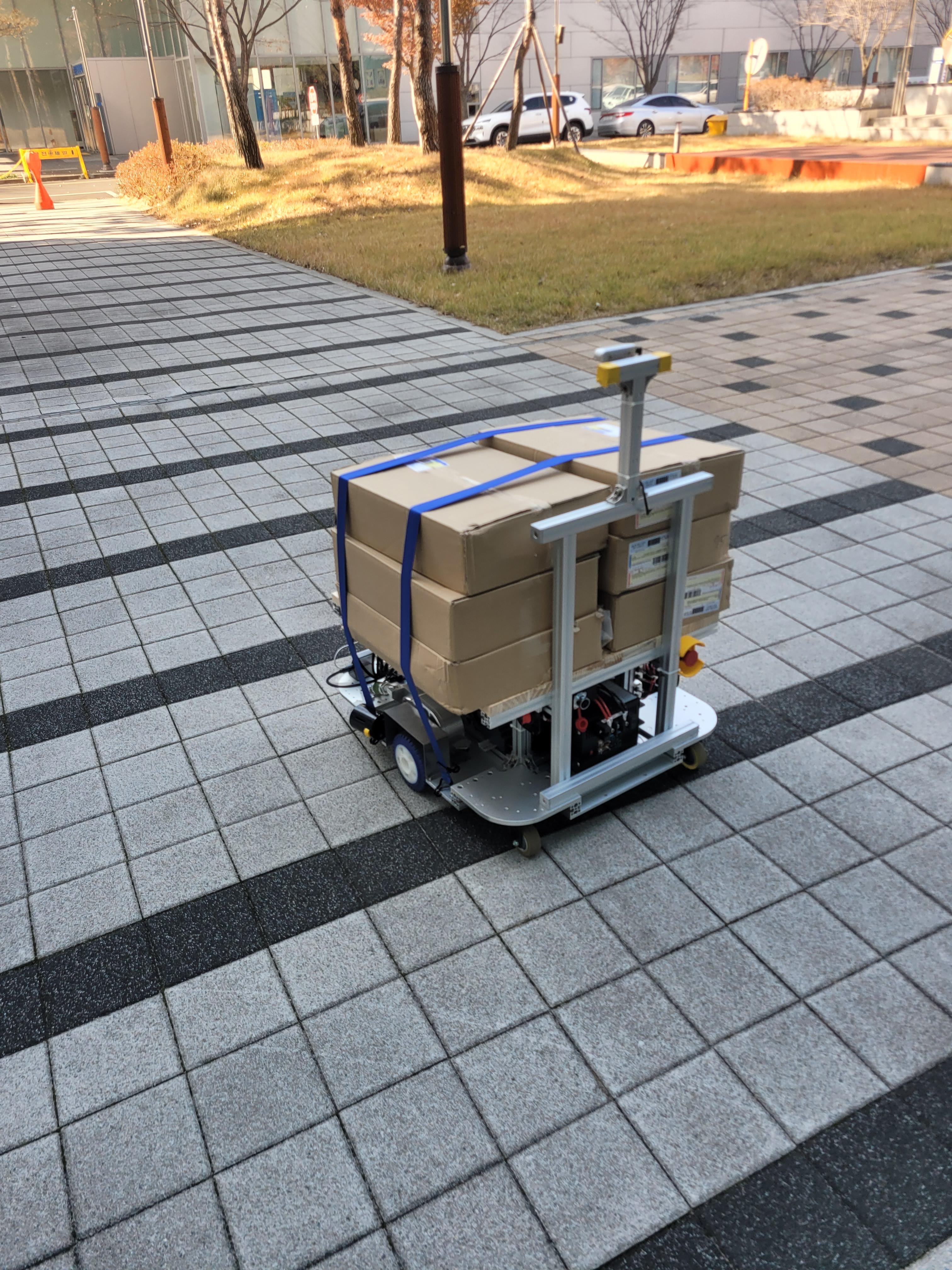 카트에 화물을 장착하지 않은 상태에서 고정 장애물을 피해 경로점을 자율주행하는 인증시험을 수행하였습니다.