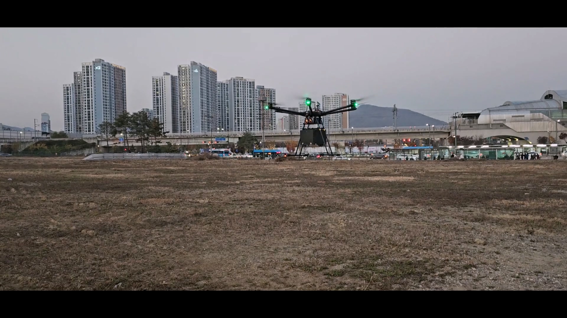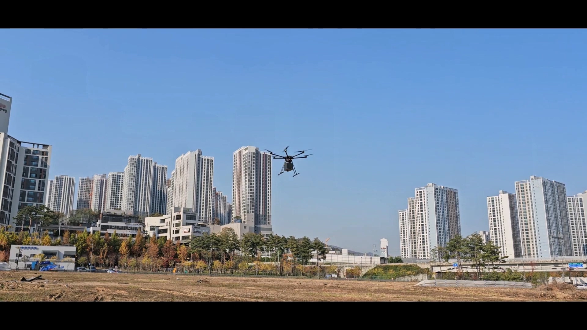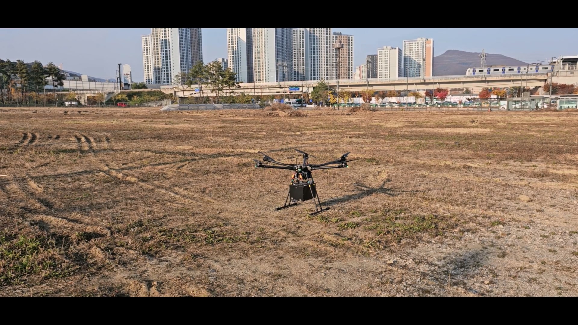 야외의 넓은 공터엣 드론 비행 테스트를 수행했습니다. 테스트 과정도 촬영하고 드론의 비행 모습도 촬영했습니다.