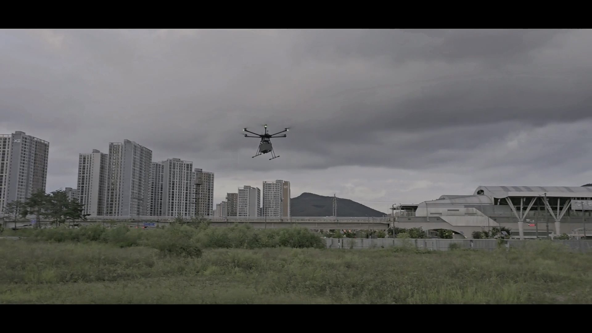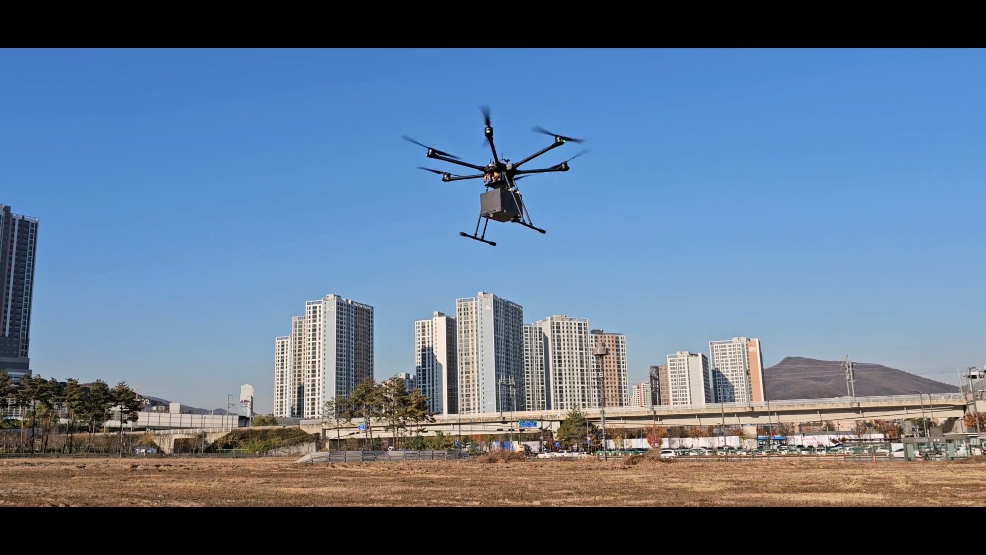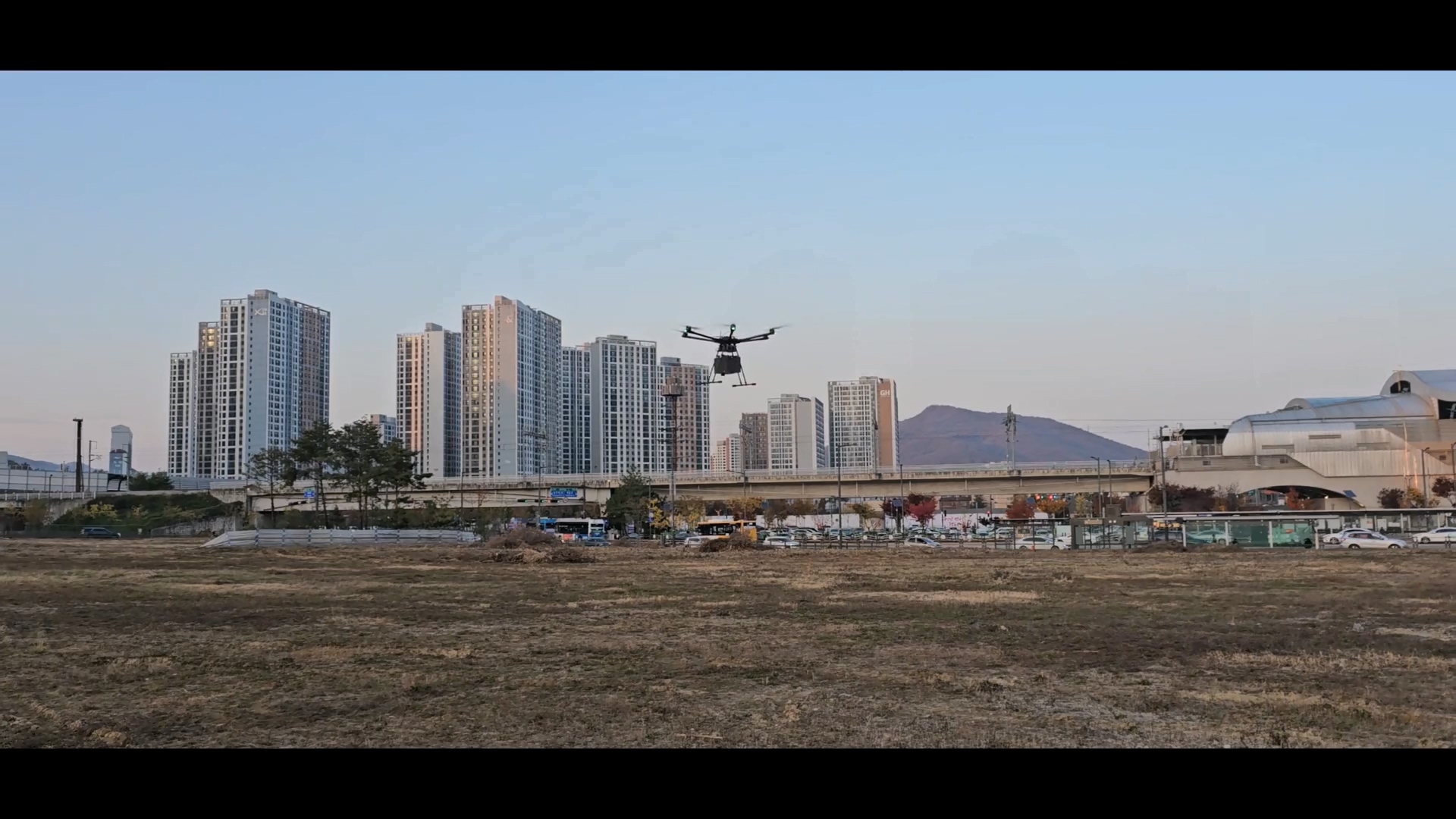 야외의 넓은 공터엣 드론 비행 테스트를 수행했습니다. 테스트 과정도 촬영하고 드론의 비행 모습도 촬영했습니다.
