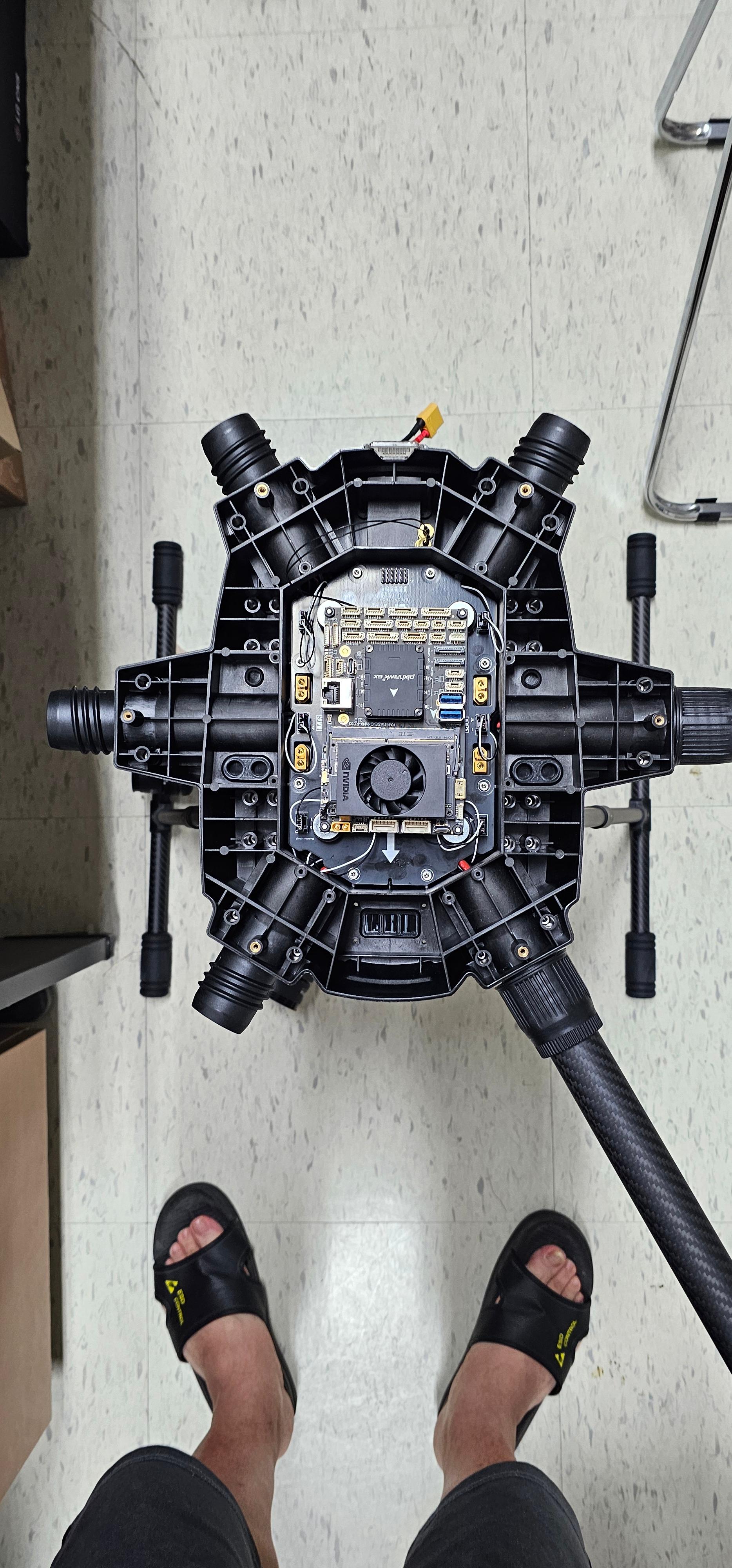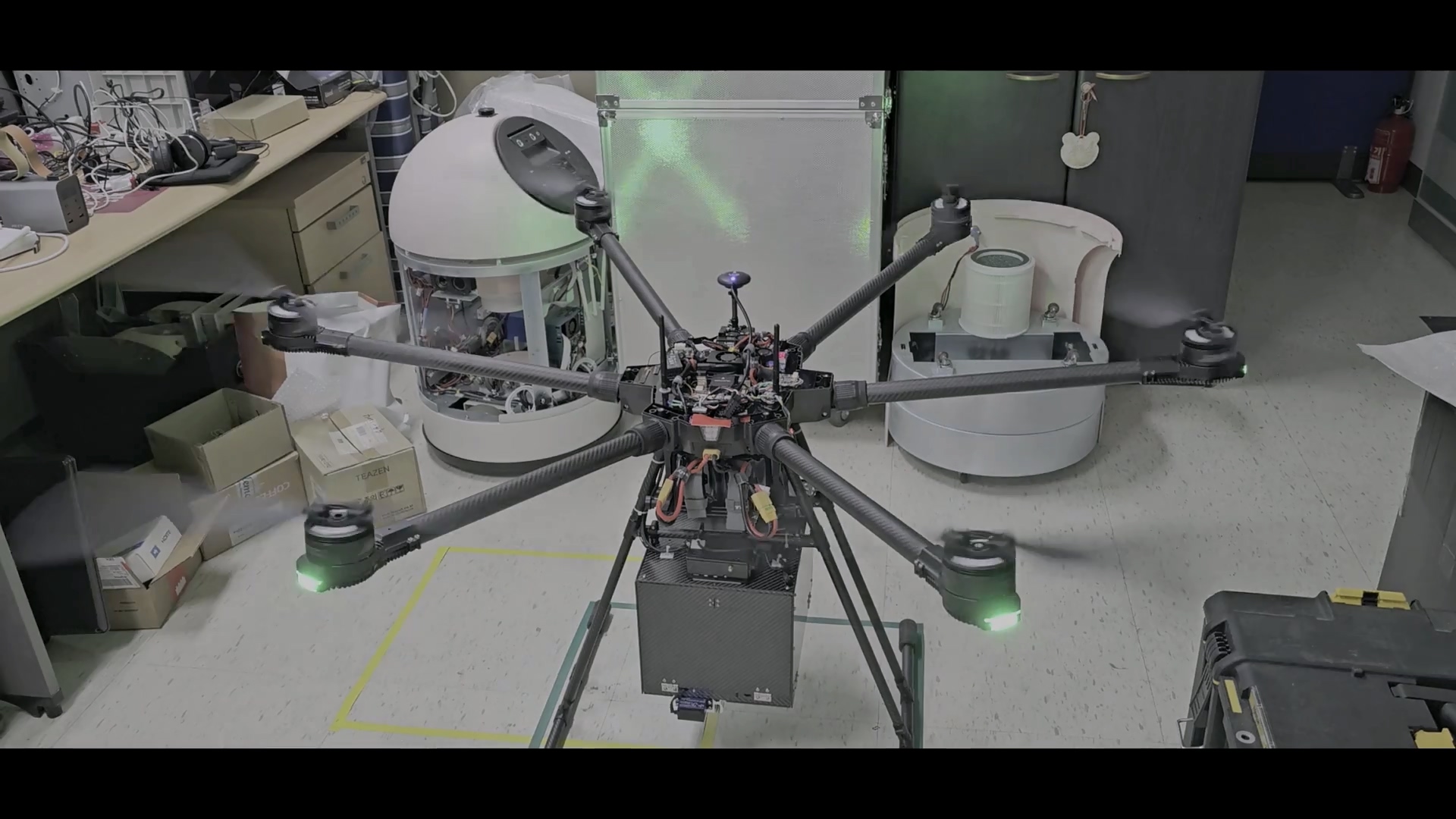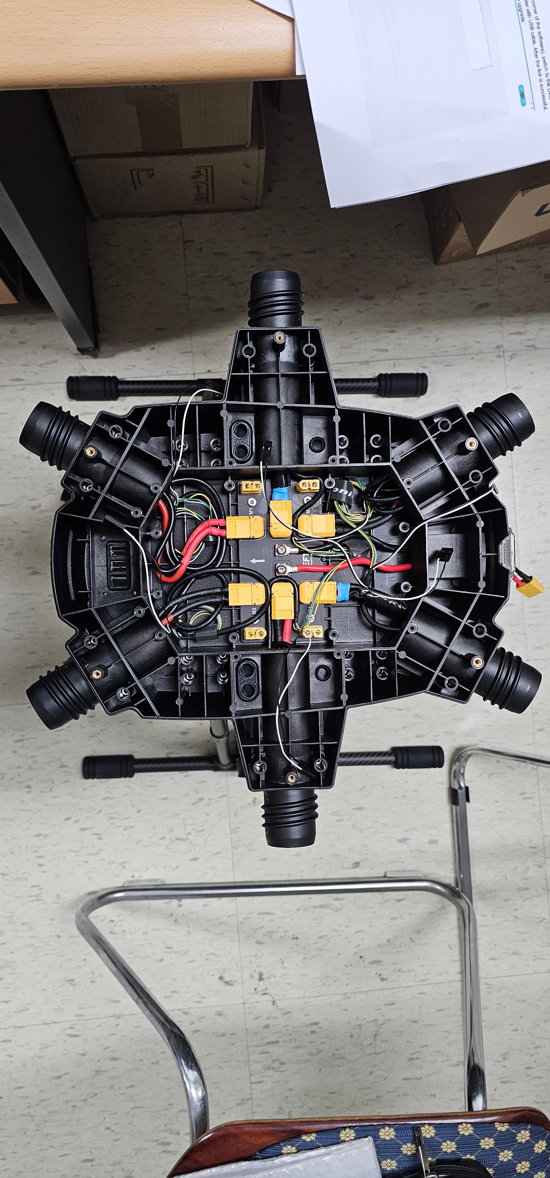드론을 조립한 후 캘리브레이션을 완료하고, 각종 파라미터를 설정한 뒤 사무실 내에서 드론 구동 테스트를 진행했습니다.
