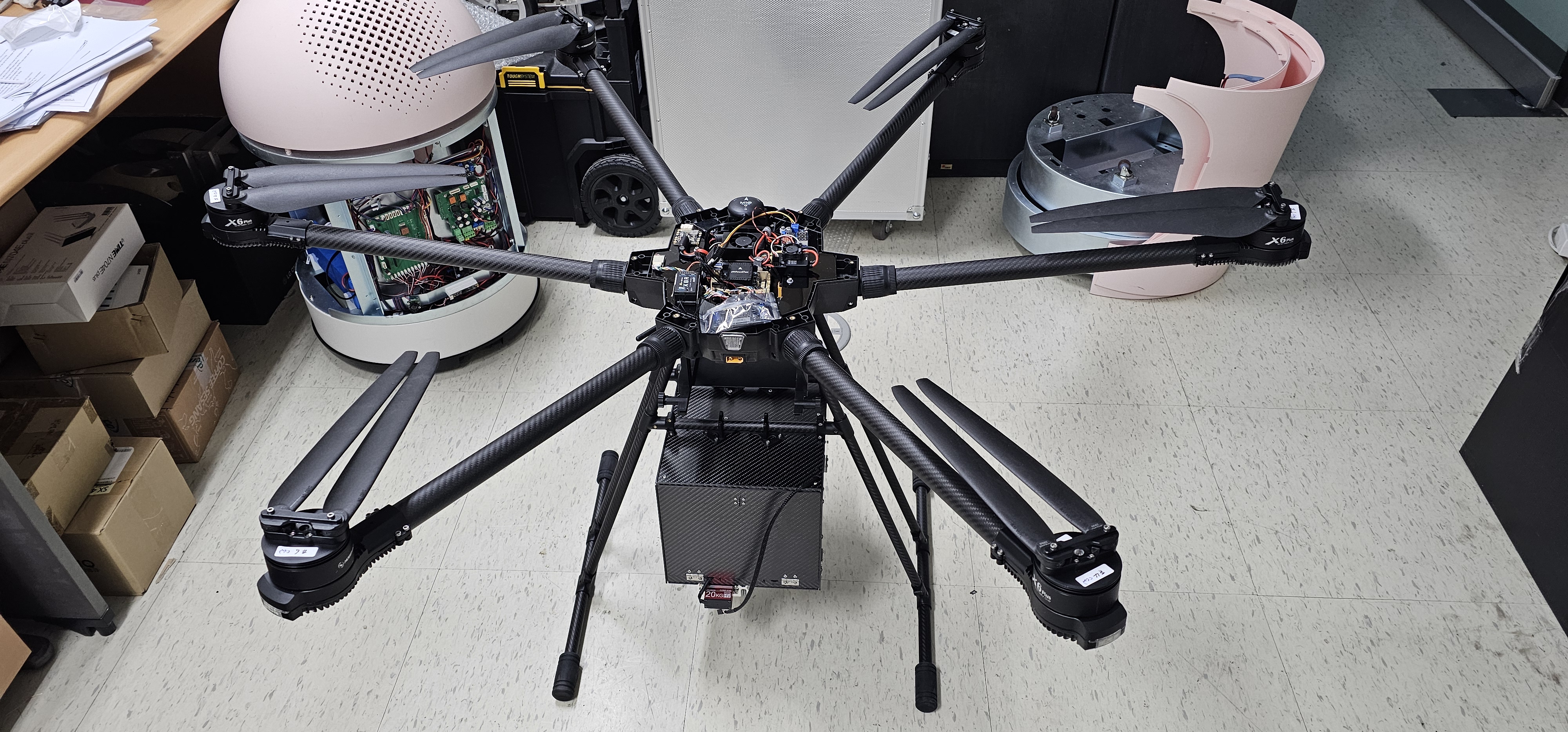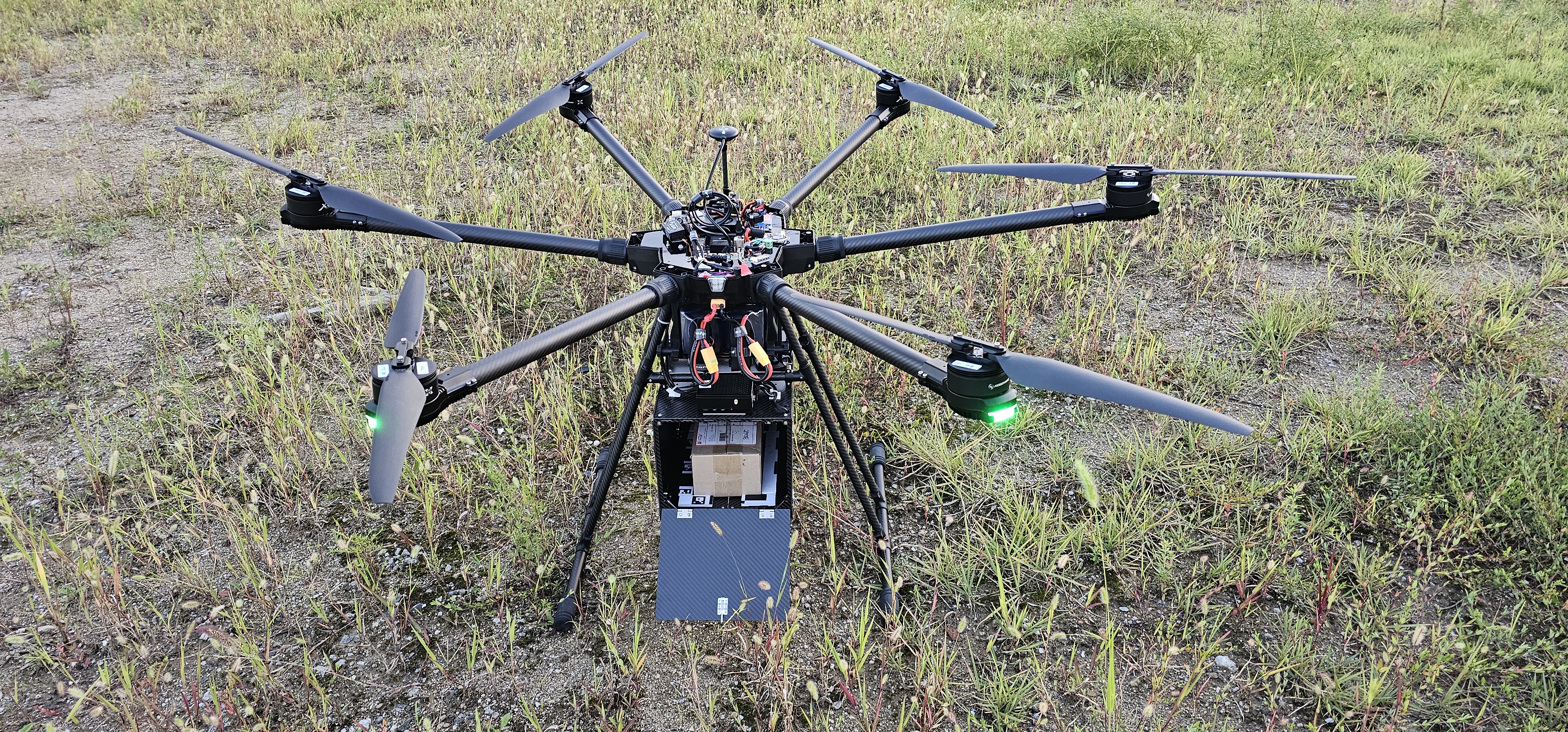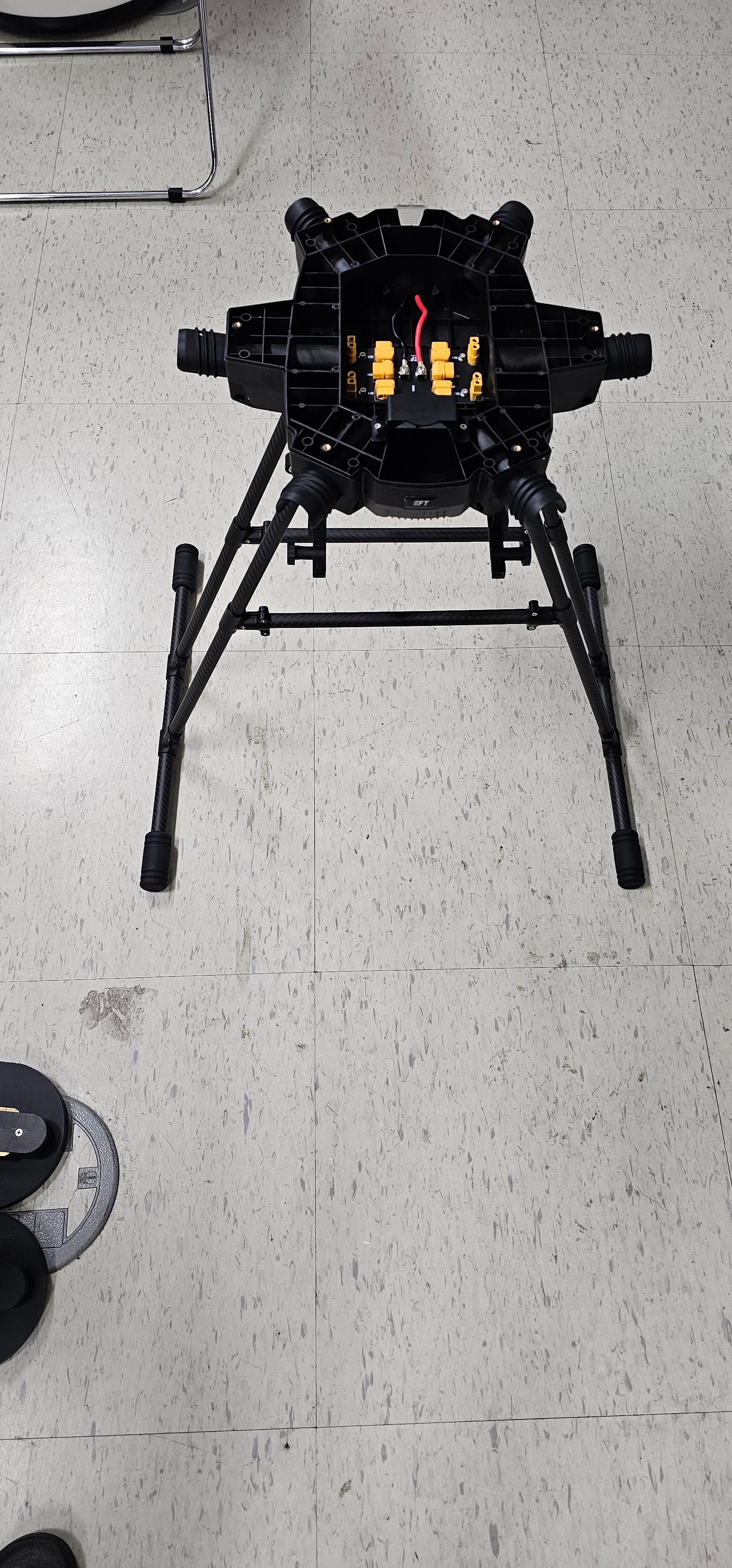 EFT X6120 산업용 드론 프레임 세트를 구입하여 직접 조립해 사용하였습니다. 해당 프레임 세트에는 Hobbywing X6 Plus 모터 6개가 포함되어 있으며, 모터의 정격 전압이 48V이기 때문에 프레임 구조에 맞추어 24V 배터리 2개를 직렬로 연결해 사용하였습니다. 드론 제어기는 Holybro의 Pixhawk Jetson Baseboard( Pixhawk 6X + Jetson Orin NX )를 사용하였으며, ROS 2 기반으로 시스템을 구성하였습니다. 베이스보드에 6축 모터를 연결하고, 무선 조종기 통신, 컴퓨터와의 Wi-Fi 통신, GPS 장착, Orin NX 보드 전원 인가, 쿨러 설치, 거리 센서 장착 등 전장 작업을 진행하였습니다.