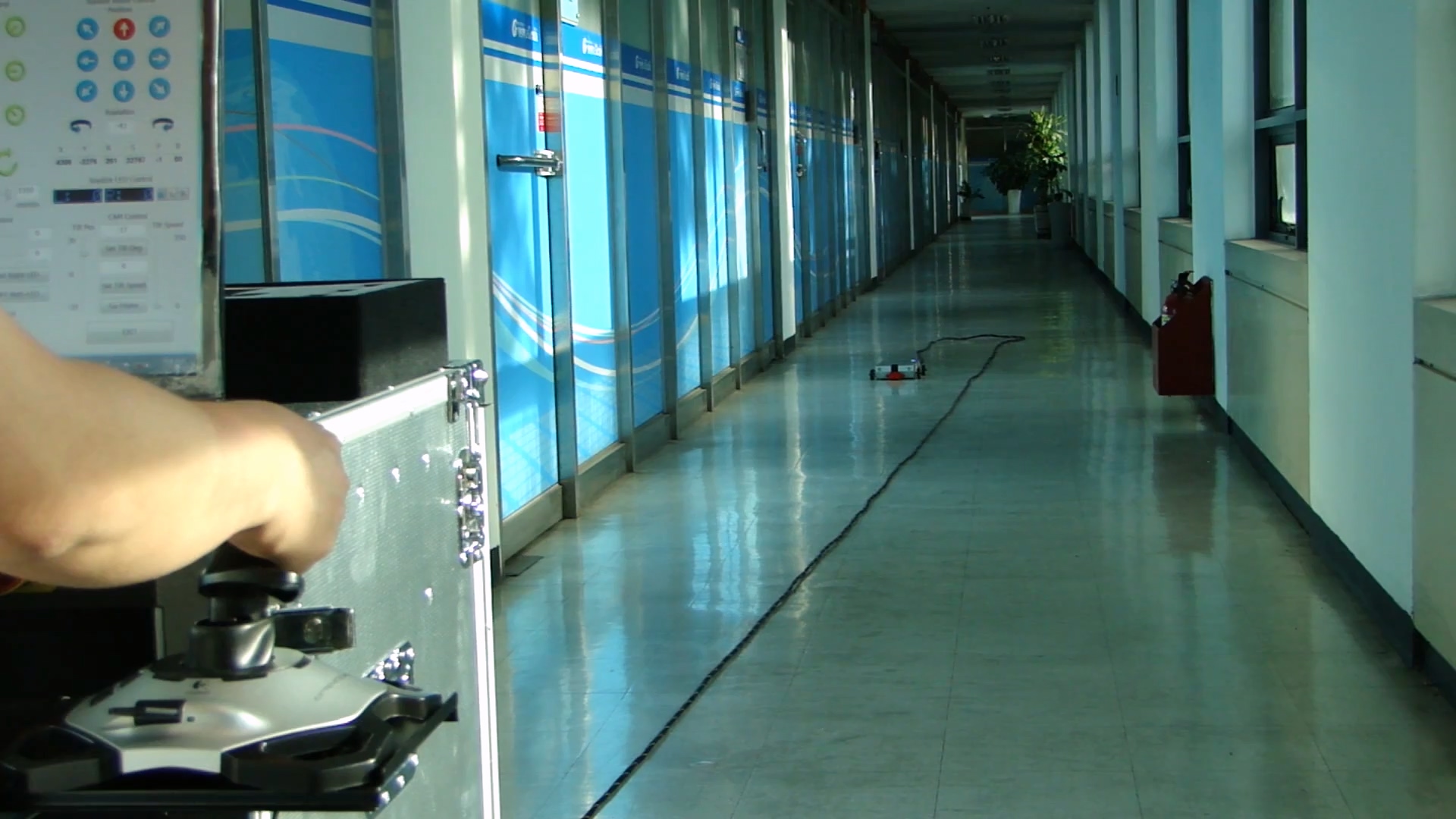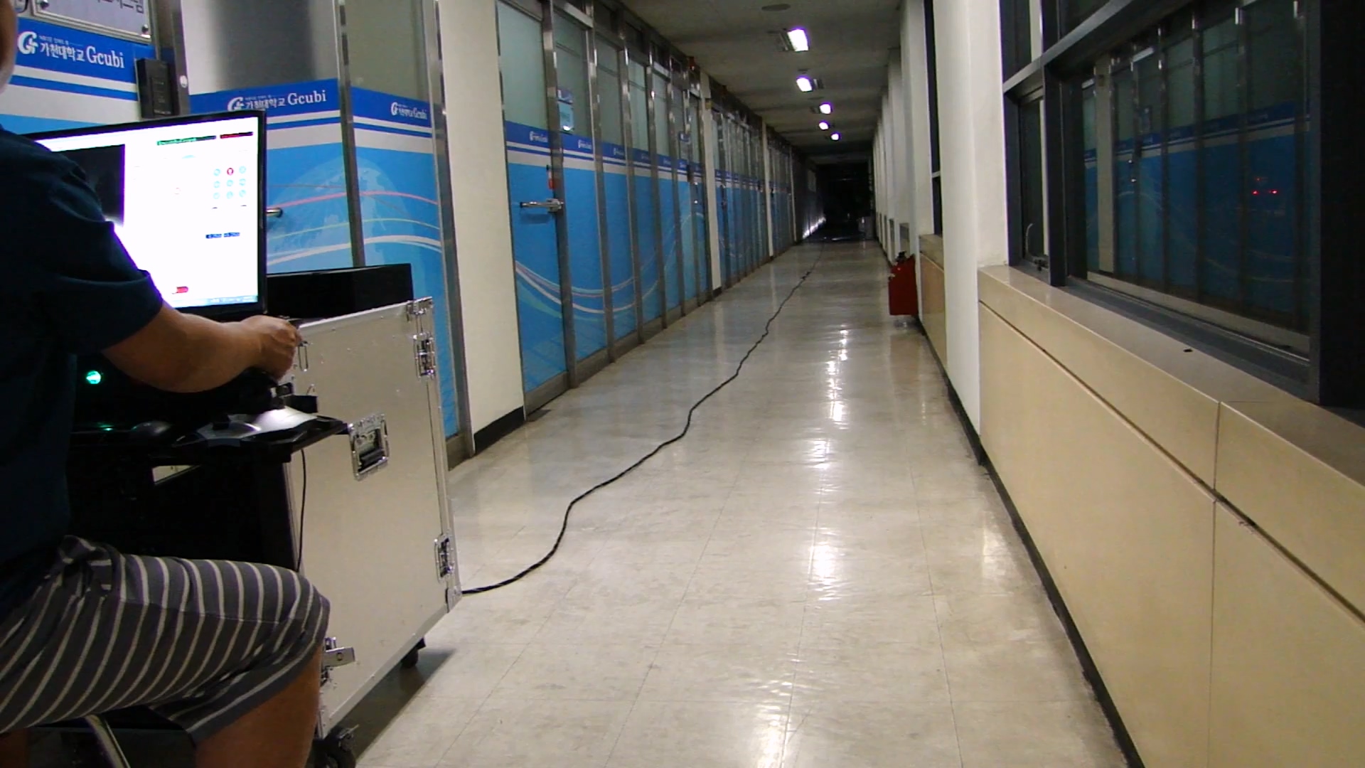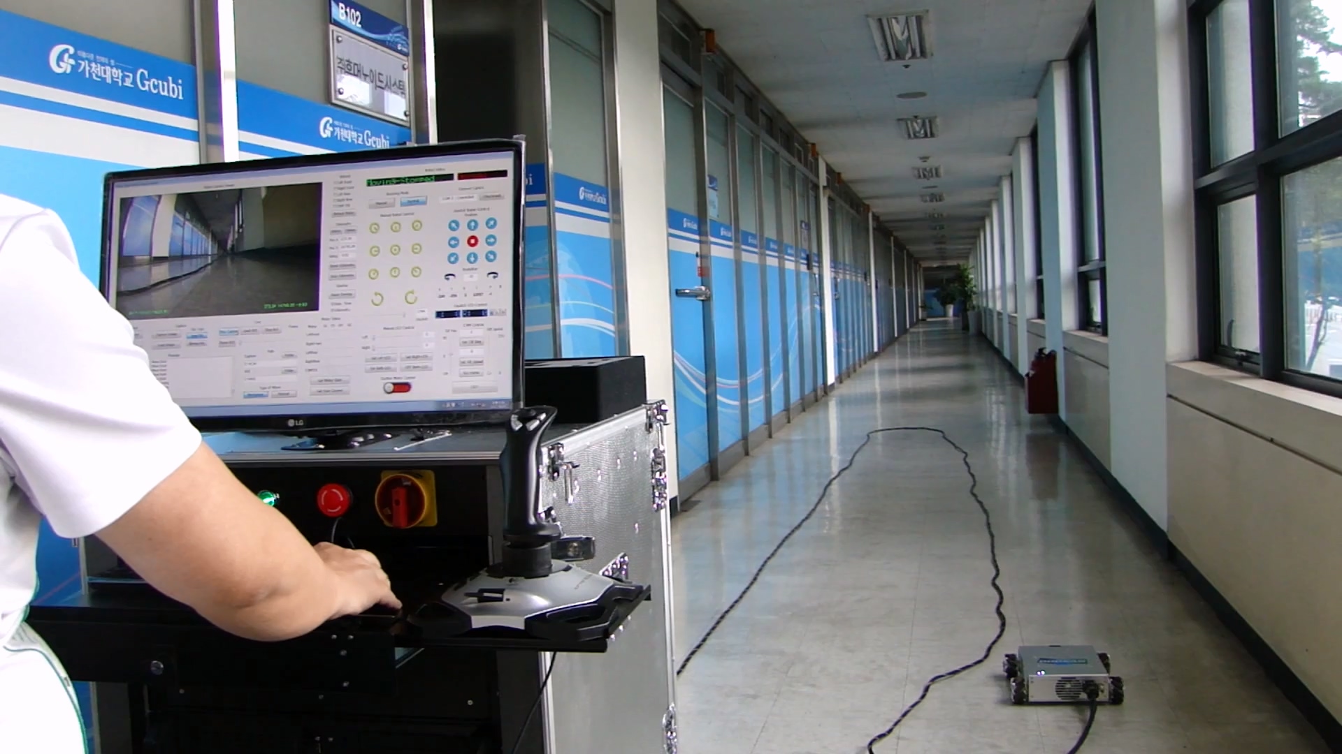 10m 길이의 케이블을 연결한 상태에서 로봇의 좌·우 이동, 전진 및 후진 동작, 그리고 LED 조명 동작을 테스트하고 있습니다.