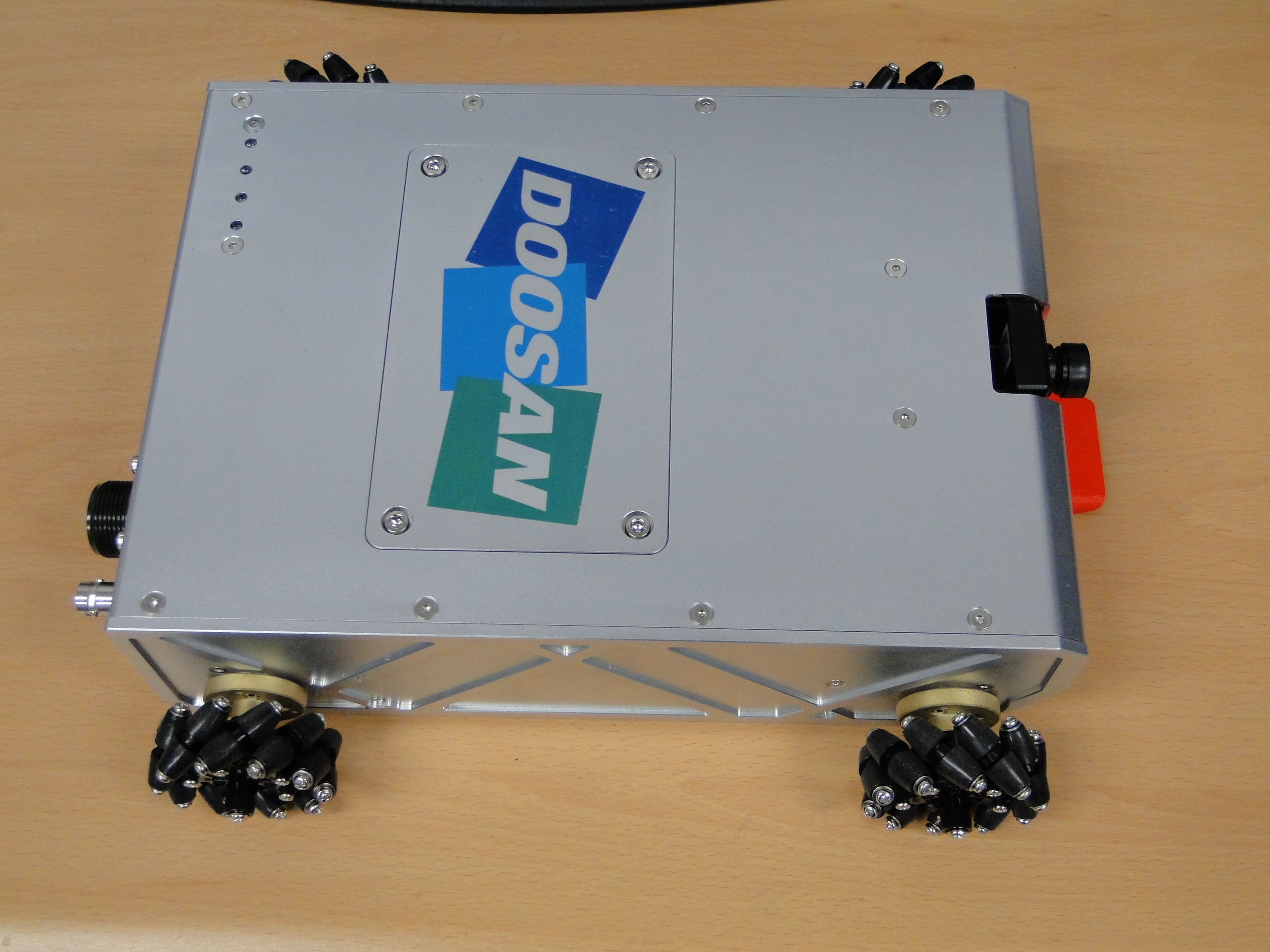 로봇은 360도 회전과 제자리 회전을 지원하며, 최대 속도는 50mm/s로 조절 가능합니다. 이동 거리 측정 기능과 함께 조이스틱 및 GUI 기반의 직관적인 조작을 지원합니다. 로봇 케이스에는 두산 로고가 실크 인쇄로 적용되었습니다.