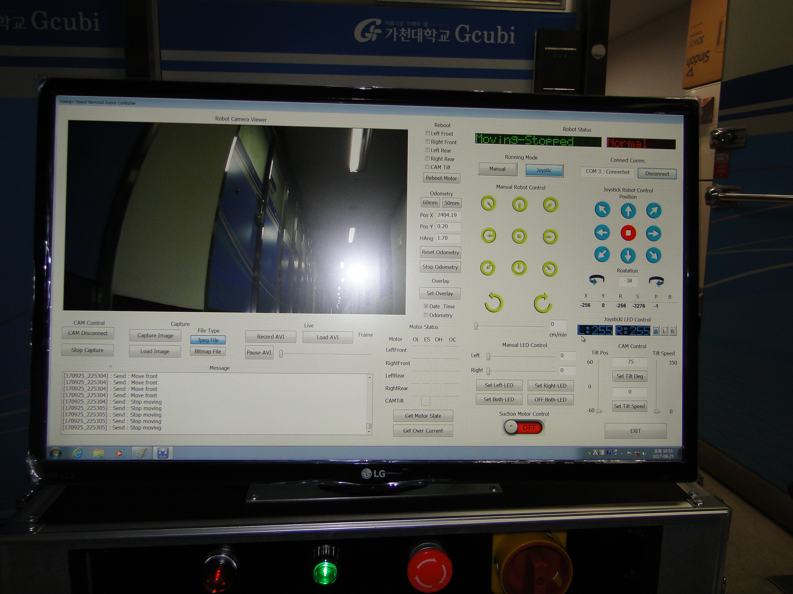 카메라는 200만 화소, 60도 이상의 화각을 지원하며 상하 각도 조절이 가능합니다. GUI를 통해 원격 모니터링, 영상 촬영, 이미지 캡처 기능을 제공하여 점검 효율을 높였습니다. 전면에는 좌·우 조명이 설치되어 있으며, 디밍 기능을 통해 환경에 맞게 밝기 조절이 가능합니다.