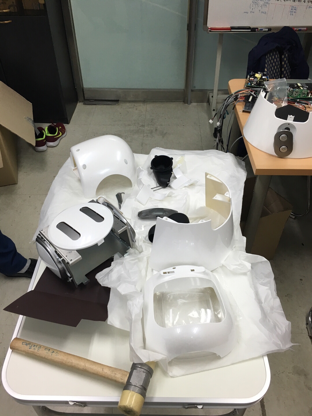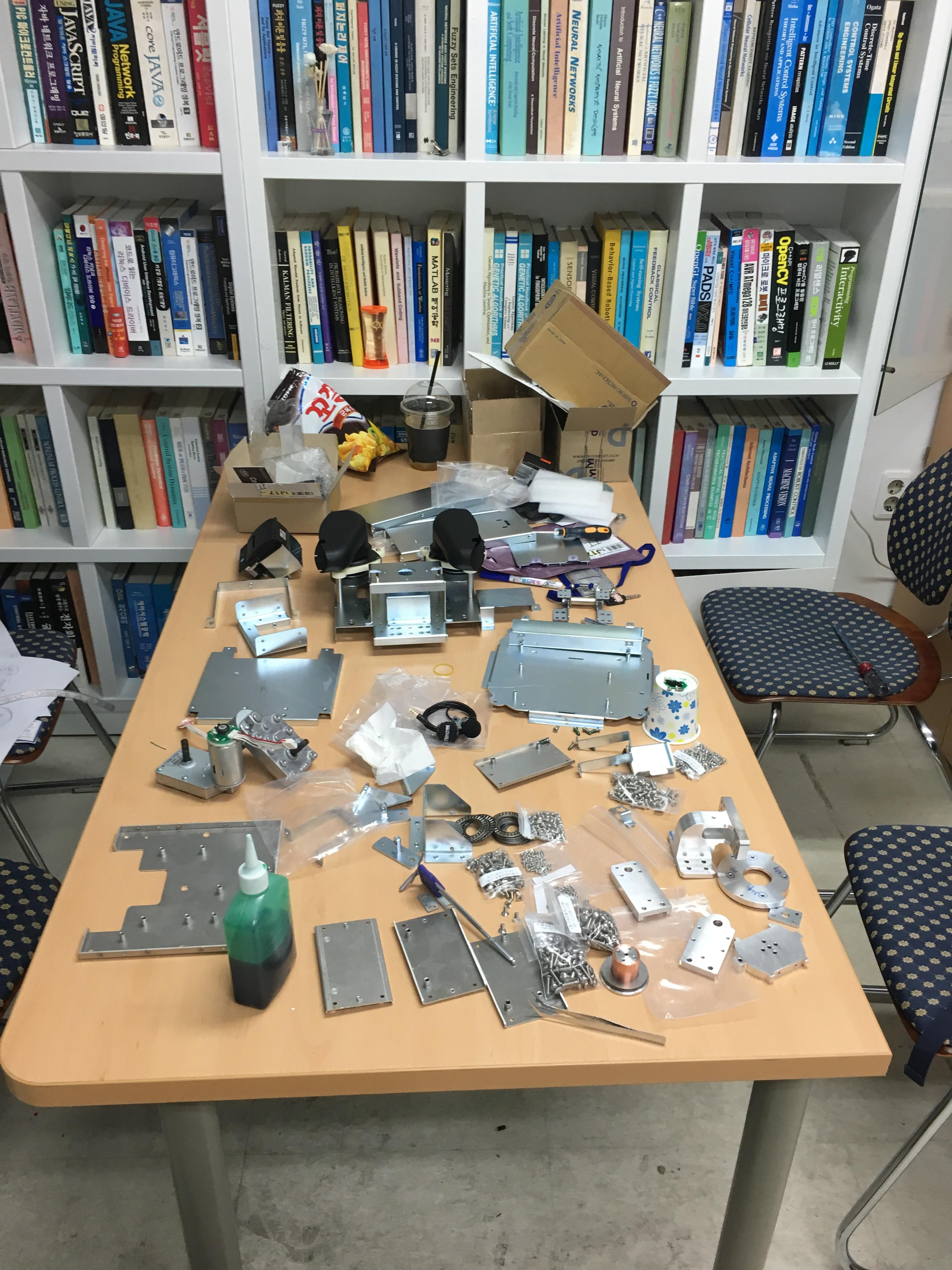 로봇을 구성하는 각 요소의 기능을 구현하고 시험을 수행했습니다. 소프트웨어 개발자, 기구 설계 및 제작 담당자, 조립 담당자, 회로 설계 및 제작 담당자, 구동 테스트 인원, 센서 및 LED·모터 구동 담당자, 서비스 시나리오 구성 담당자, 로봇 디자인 담당자들이 협력하여 2개월도 채 되지 않는 짧은 시간 안에 로봇 시제품을 제작하기 위해 최선을 다했습니다.