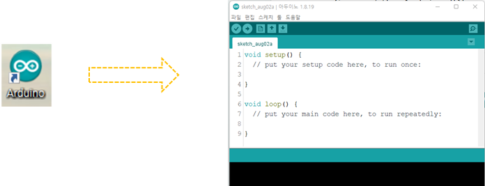바탕 화면에서 설치된 Arduino 프로그램 아이콘을 더블 클릭하여 실행합니다.