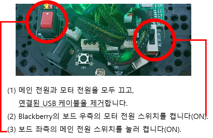 모터 전원 스위치를 켜면 기존에 저장된 프로그램이 실행되어 Blackberry가 갑자기 움직일 수도 있으니 주의해야 합니다. 액츄에이터를 사용하지 않을 경우 스위치는 off 상태로 두어도 됩니다.
