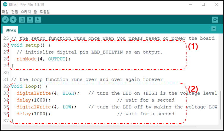 오류가 없이 프로그램 업로드가 끝나면 바로 실행됩니다(보드의 빨간 LED가 1초 주기로 On/Off 반복 점멸).