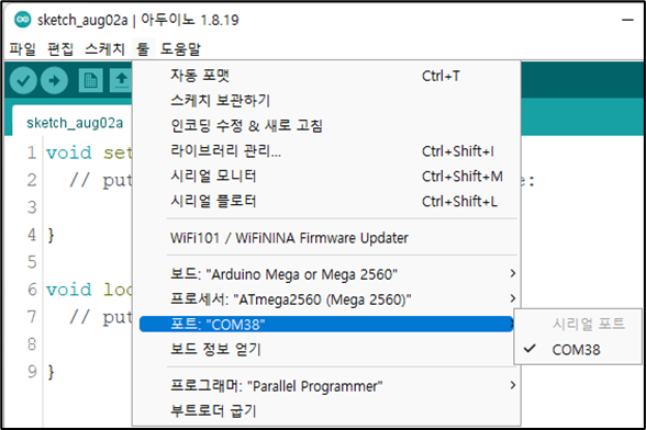 Arduino 소프트웨어의 [툴] 메뉴에서 “보드” -> “Arduino Mega or Mega 2560”을 선택합니다.