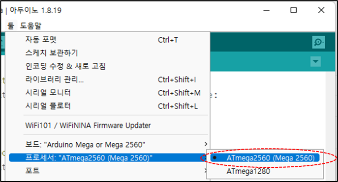 Arduino 소프트웨어의 [툴] 메뉴에서 “프로세서” -> “ATmega2560 (Mega 2560)”을 선택합니다.