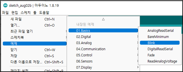 - Arduino 소프트웨어의 [파일] ▶ [예제] ▶ [01.Basics] 메뉴에서 “Blink”를 선택합니다.