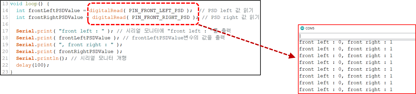 int frontLeftPSDValue = digitalRead( PIN_FRONT_LEFT_PSD ); // PSD left 값 읽기