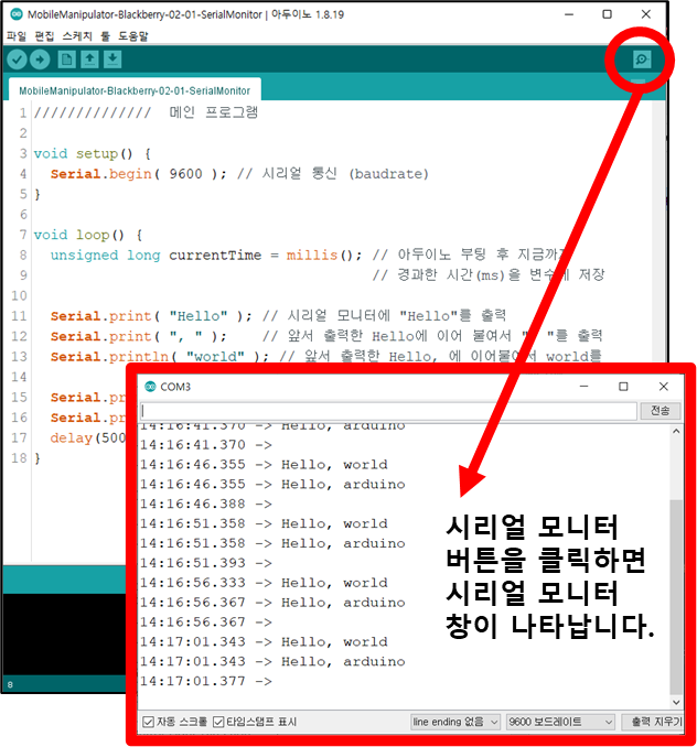 - 블랙베리에 소스코드를 업로드 후 시리얼 모니터 버튼을 클릭합니다.