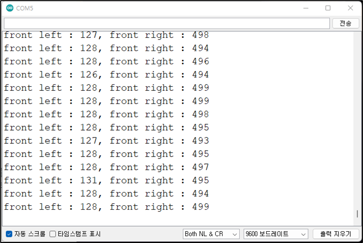 Serial.print( "front left : " ); // 시리얼 모니터에 "front left : "를 출력