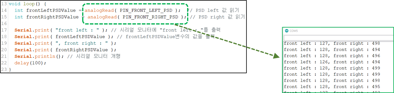 int frontLeftPSDValue = analogRead( PIN_FRONT_LEFT_PSD ); // PSD left 값 읽기