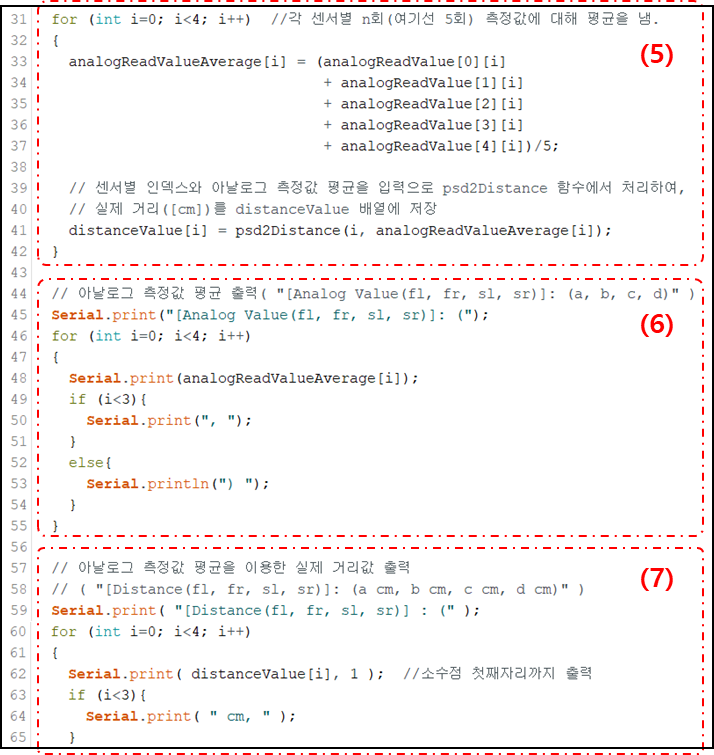 for (int i=0; i<4; i++) //각 센서별 n회(여기선 5회) 측정값에 대해 평균을 냄.