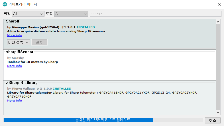 아래의 그림과 같이 관련 라이브러리 리스트가 출력됩니다. 여기에서 "SharpIR"의 "설치" 버튼을 클릭합니다.