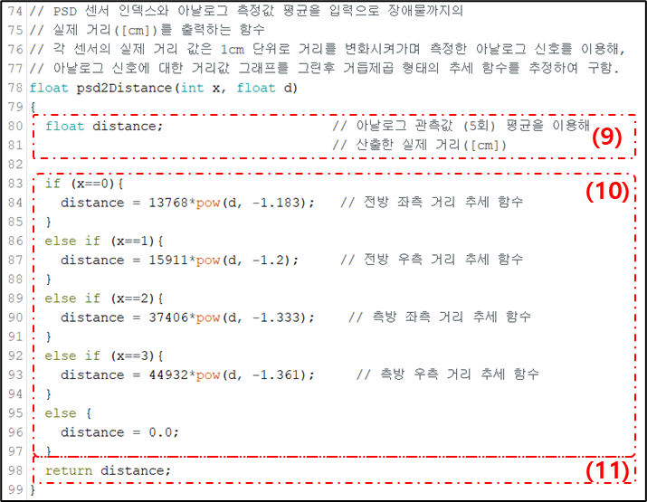 PIN_NUM 배열에 저장된 PSD 센서 핀 번호의 인덱스 x와 센서 값 d를 받아 PSD 센서 값을 거리 값으로 변환해주는 함수 psd2Distance는 아래와 같이 동작합니다.