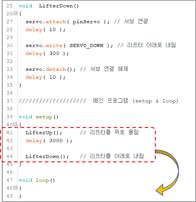 [추가 실습] 점선의 코드를 loop 함수 안에 넣고 다시 실행해봅니다. LifterDown(); 아래에 delay(3000);을 추가합니다.