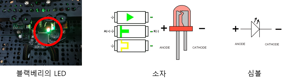 다이오드는 특성상 순방향 전류만 흐르게 하기 때문에 극성을 제대로 연결하는 것이 중요합니다. 그래서 LED소자에는 각각의 다리(리드)를 어떤 극성에 연결해야 하는지 표시가 되어있습니다. +극을 애노드, -극을 캐소드라고도 부릅니다. 극성을 반대로 연결하면 전류가 흐르지 않게 되어 LED는 켜지지 않습니다.