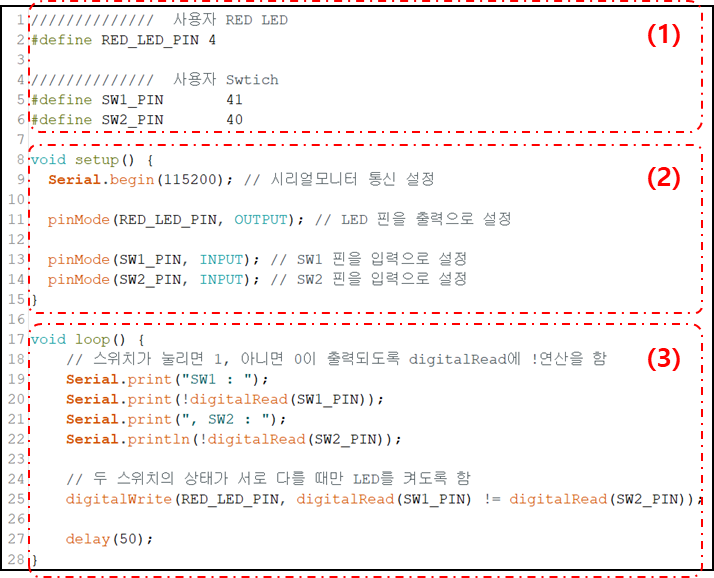3. loop에서는 SW1과 SW2의 상태 값을 읽어 시리얼 모니터에 출력하고, SW1과 SW2의 상태 값이 서로 다를 때 RED LED를 켜는 동작을 반복합니다.