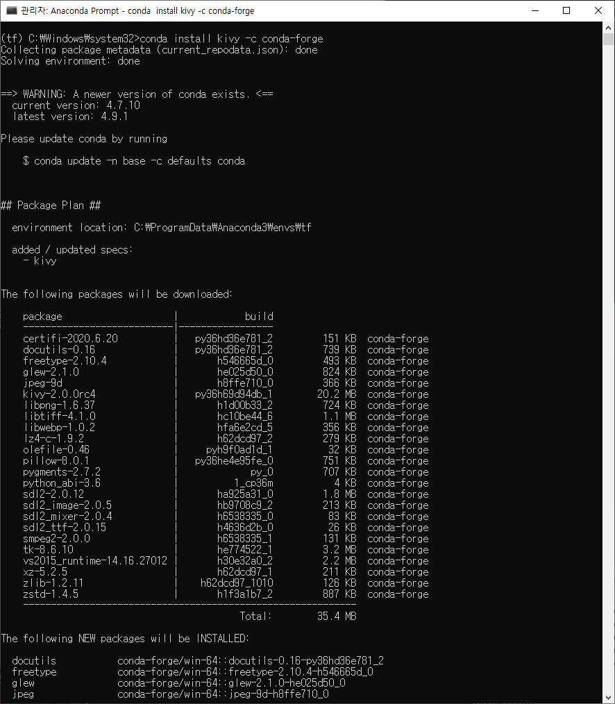 7. 아래의 명령어를 입력하여 kivy를 설치한다.