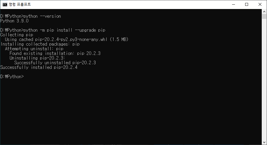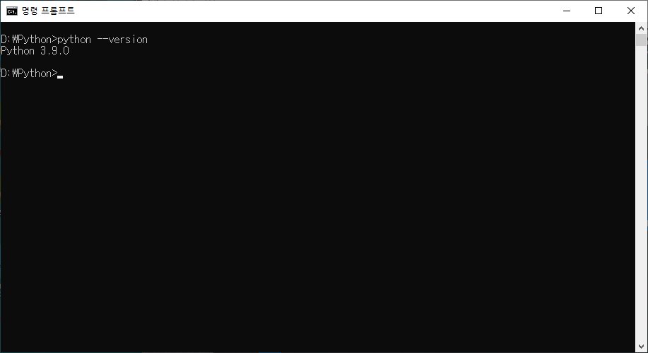 9. cmd 창을 실행하고 아래의 명령어를 입력하여 버전 정보가 출력될 경우, 파이썬이 정상적으로 설치됨을 확인할 수 있다.