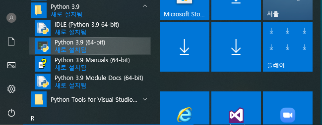 8. 정상적으로 설치가 완료되면, 윈도우 시작에서 아래의 그림과 같이 Python 3.9 버전의 설치 상태를 확인할 수 있다.