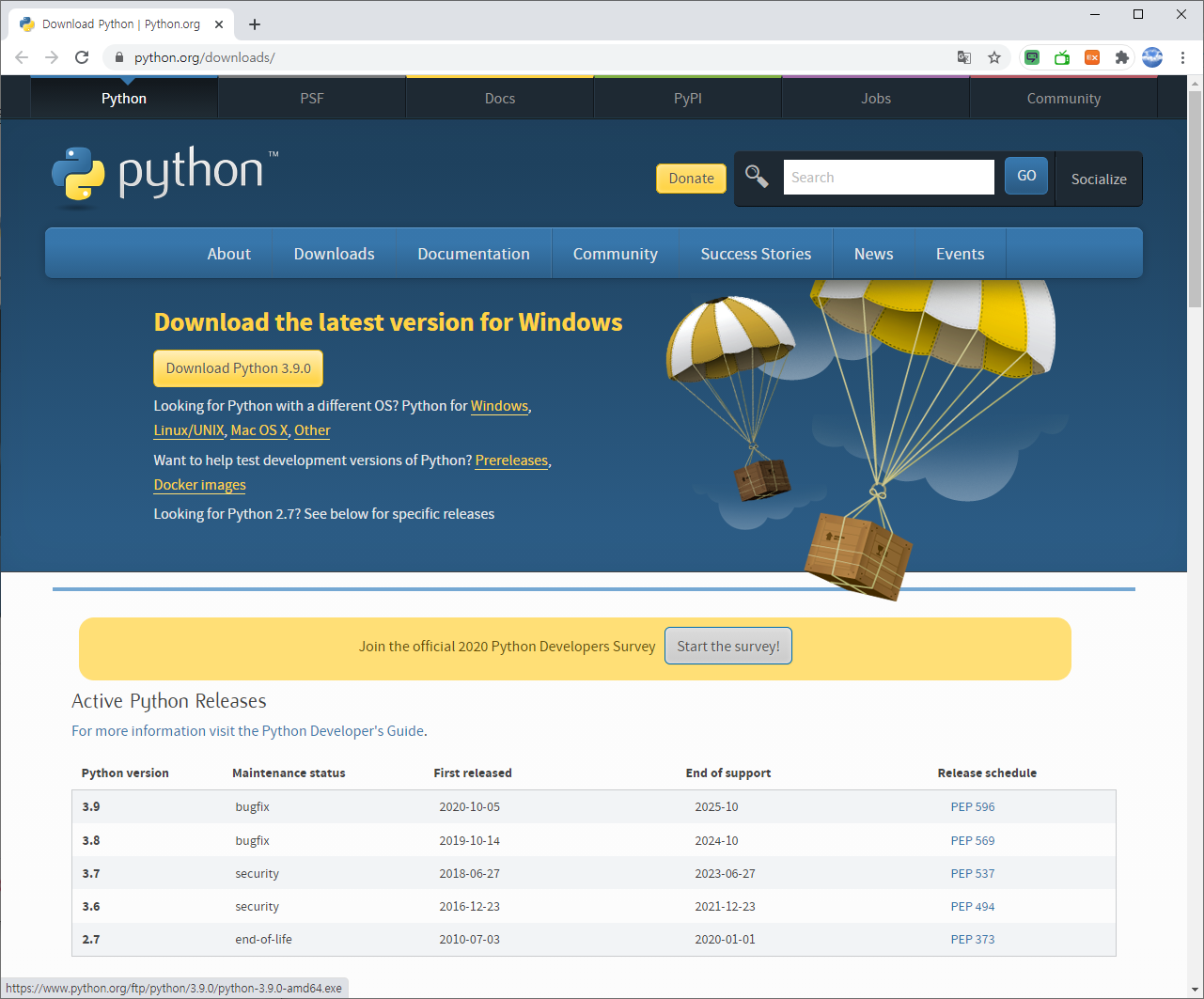 2. 최신 버전인 3.9 설치 파일을 다운로드한다. 실행파일 이름은 python-3.9.0-amd64.exe이다.