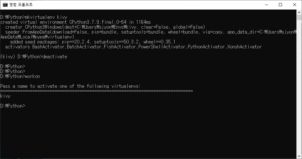 13. 아래의 명령을 입력하여 새로운 파이썬 가상환경을 생성한다. 가상 환경을 생성할 때 도움말을 보고 싶으면 --help 옵션을 사용한다. kivy라는 가상 환경이 생성되고 정상적으로 생성될 경우 가상환경이 activate 된다.