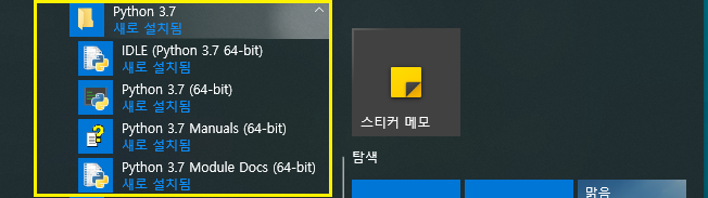 8. 정상적으로 설치가 완료되면, 윈도우 시작에서 아래의 그림과 같이 Python 3.7 버전의 설치 상태를 확인할 수 있다.
