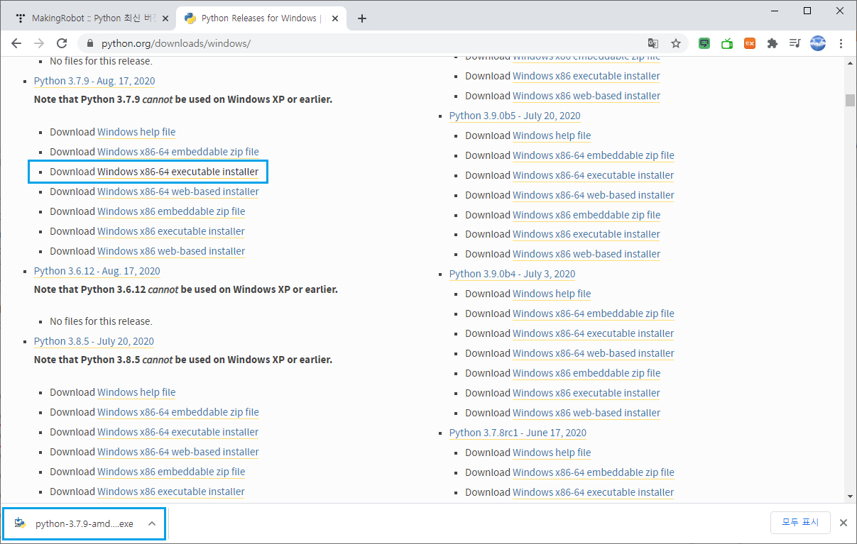 2. windows 페이지로 이동하여 Python 3.7.9-Aug.17,2020에 있는 executable installer의 링크를 클릭하여 설치 실행파일을 다운로드한다.