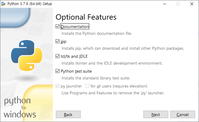 4. 문서(Document), 파이썬 설치 툴인 pip(Package Installer for Python)는 반드시 선택한다.