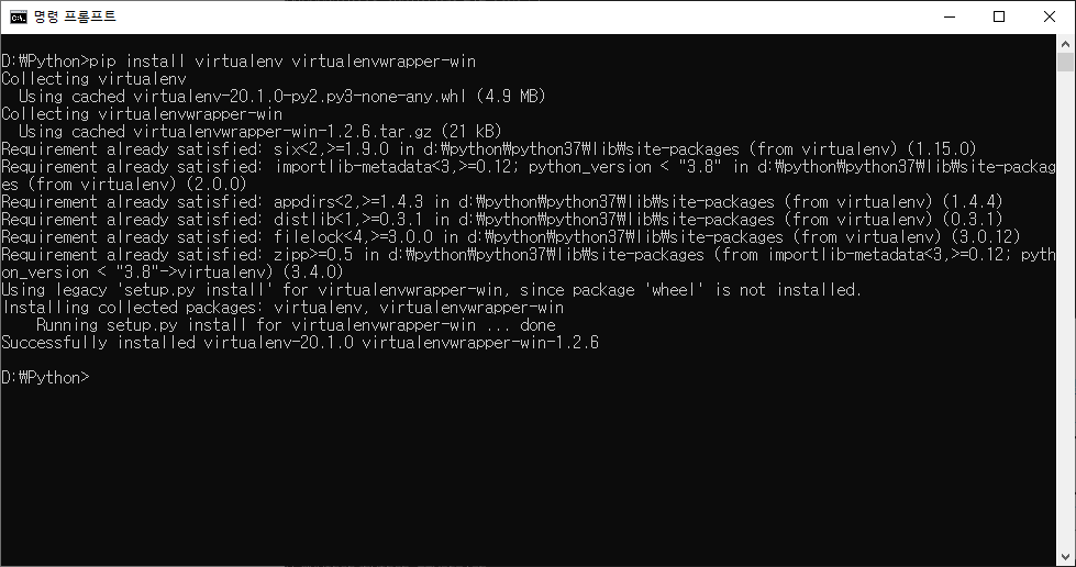12. 파이썬의 가상 환경을 설치한다. 또한 윈도우용 명령어 셋을 지원하는 virtualenvwrapper-win도 설치한다.