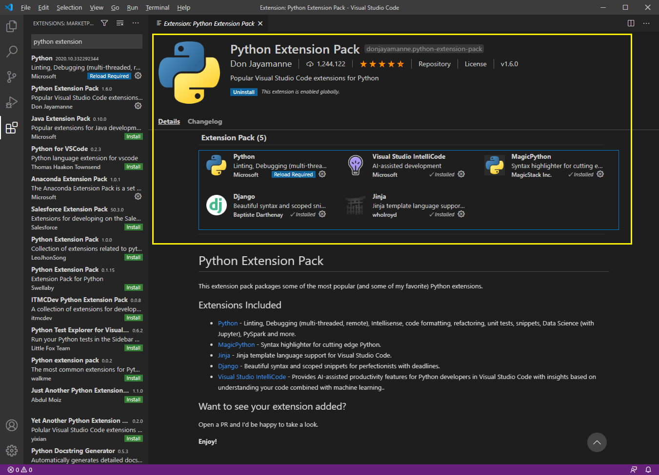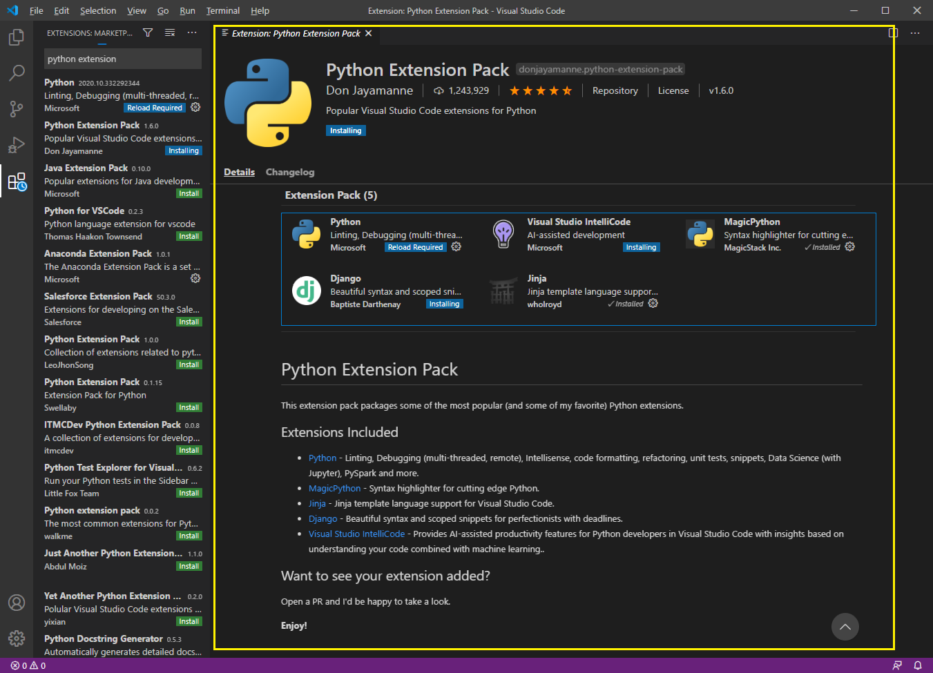 11. 아래의 그림은 Python extension 패키지 설치가 완료된 상태를 나타낸 것이다.