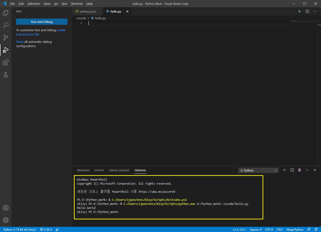19. F5를 눌러 프로그램을 실행한다. 하단에 터미널 창이 출력되면서 해당 메시지가 출력된다.