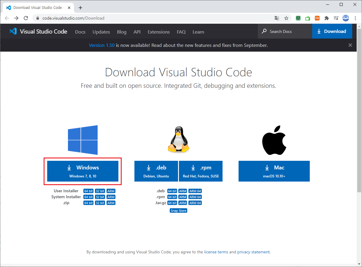 1. Visual Studio Code 홈페이지의 Download 페이지에 접속한다.