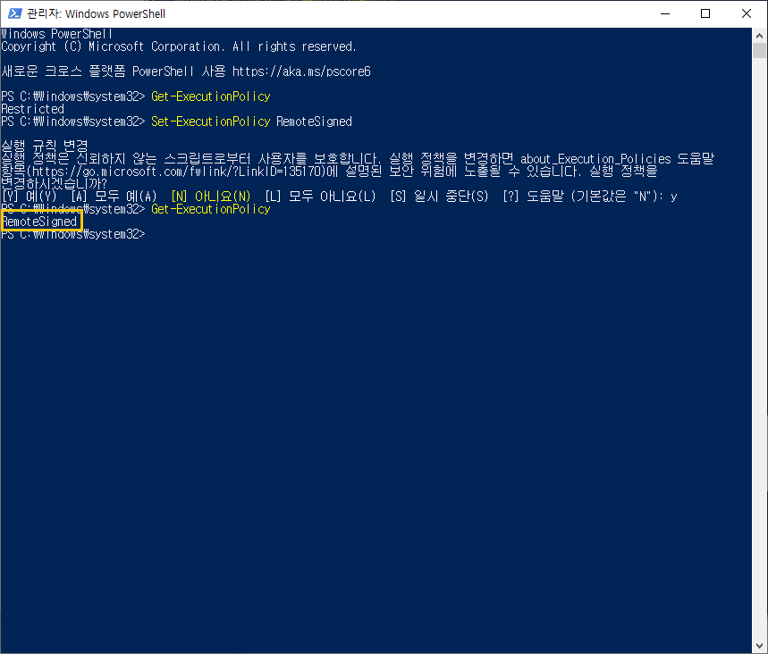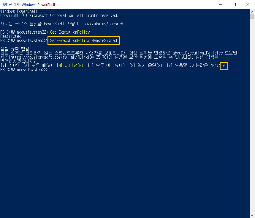 23. 위와 같이 Restricted로 설정되어 있을 경우 Set-ExecutionPolicy RemoteSigned를 입력하여 권한이 RemoteSigned 가 되도록 한다. Y를 눌러 설정을 종료한다.