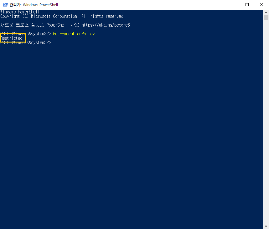 22. Get-ExecutionPolicy 명령어를 입력하여 현재 설정된 권한을 확인한다.