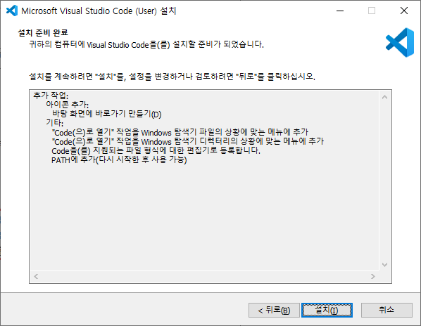 4. 설치 설정에 대한 요약내용을 출력하는 창에서 설치 버튼을 클릭한다.