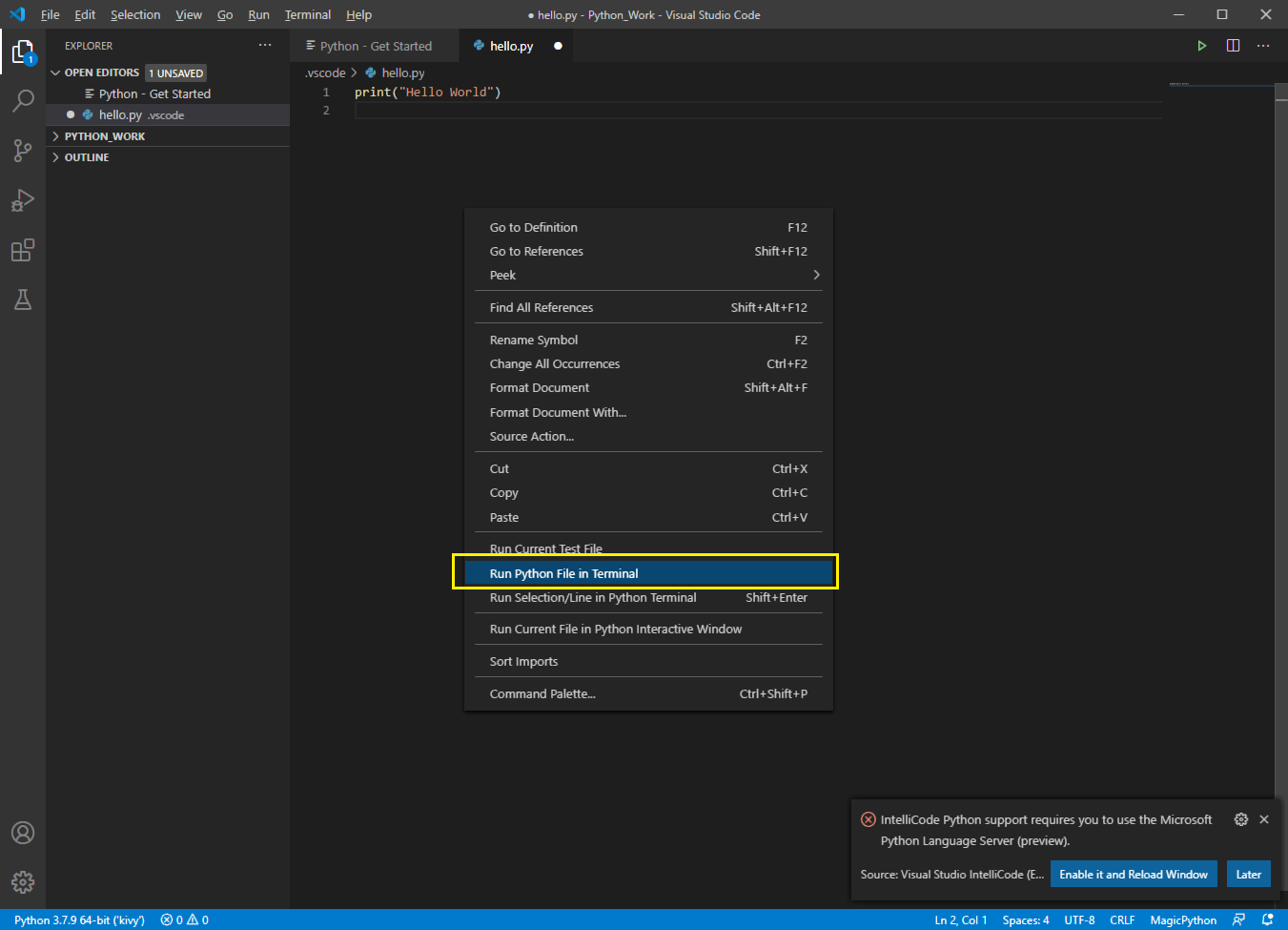 18. 소스 입력이 완료되면, 마우스 오른쪽 버튼을 클릭하고 Run Python File in Terminal을 클릭한다.