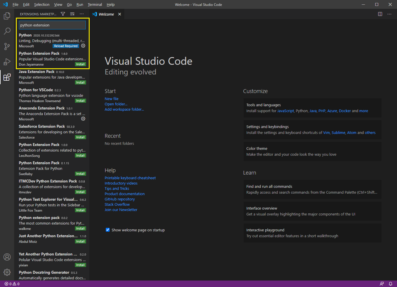 9. Extension(좌측의 메뉴바를 선택하거나 Ctrl+Shift+X 조합키 사용)에서 Python extension을 검색한다.