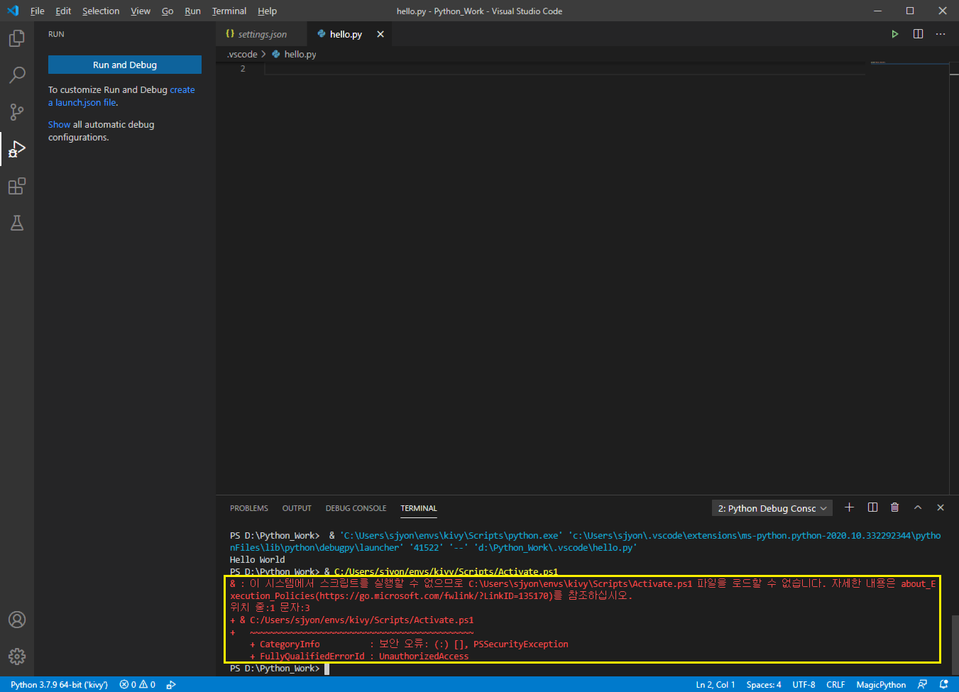 + CategoryInfo : 보안 오류: (:) [], PSSecurityException
