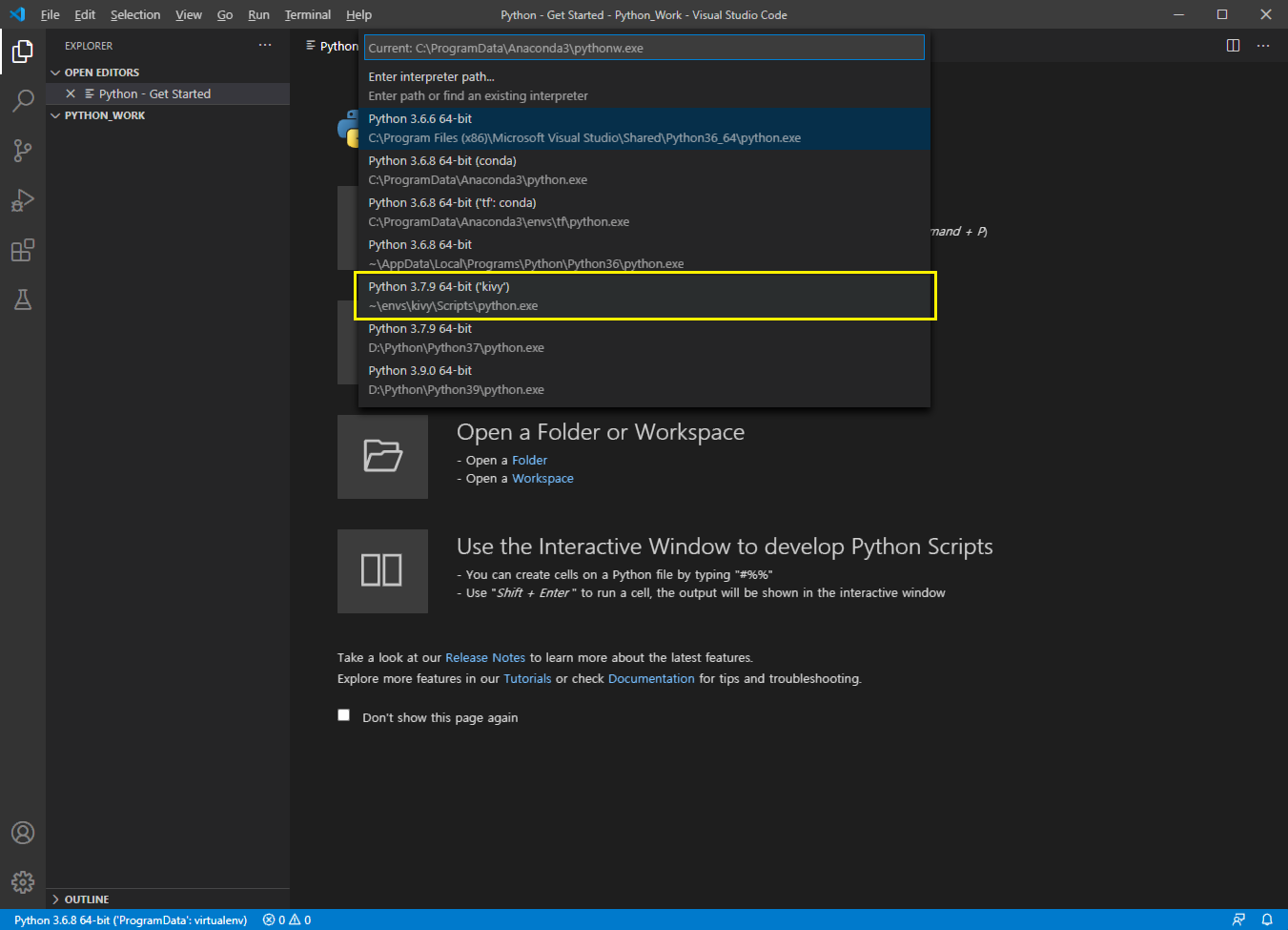 15. 현재 컴퓨터에 설치되어 있는 파이썬의 버전과 미리 생성한 가상 환경이 출력된다.