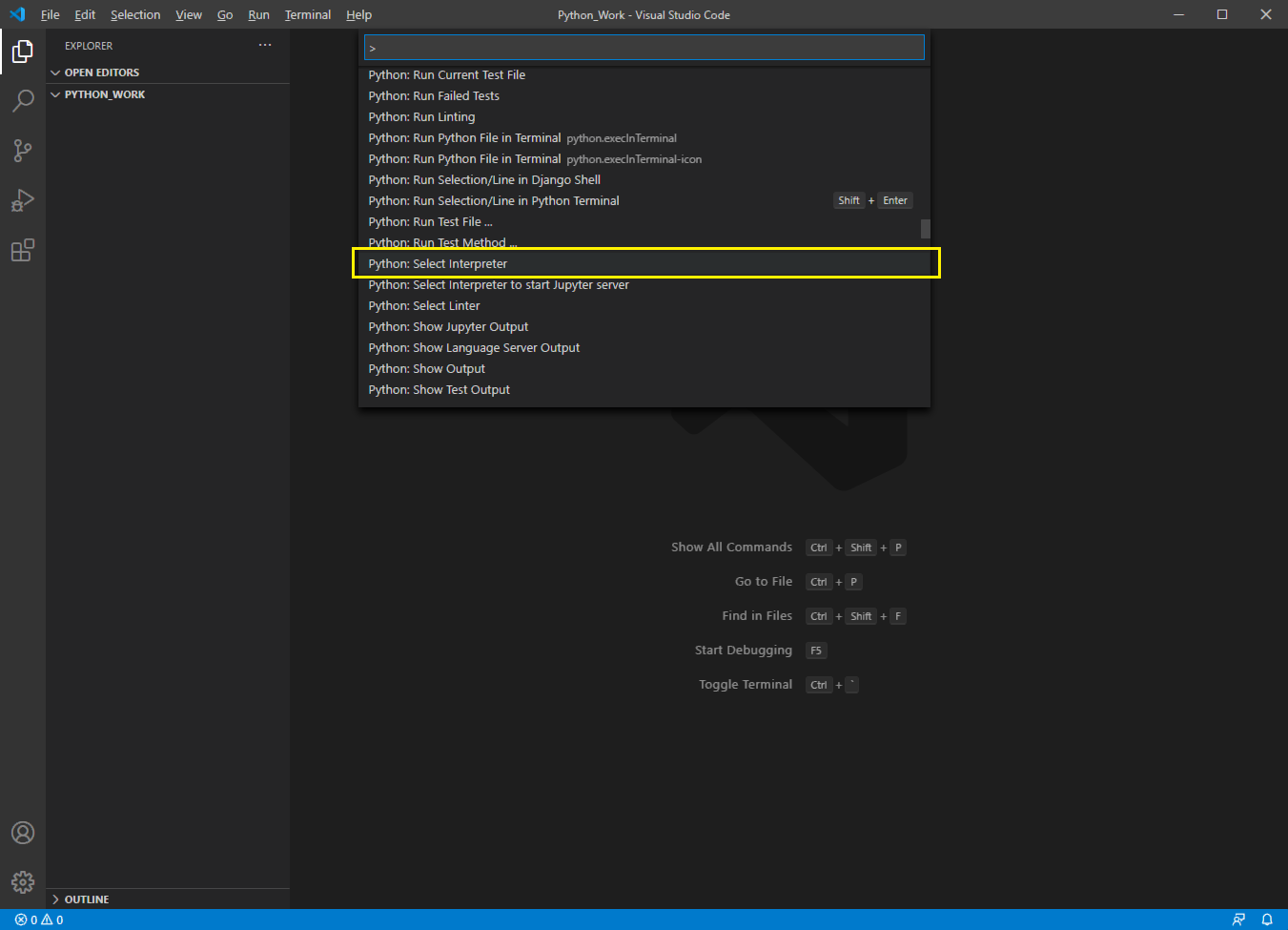 14. F1 키를 누르고, python select interpreter를 클릭한다.
