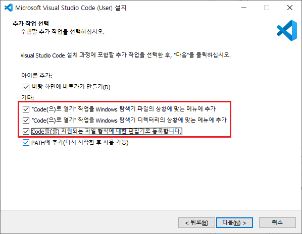 3. 다음 버튼을 클릭하고, 아래와 같이 사용의 편의를 위해 3가지를 체크하고 다시 다음 버튼을 클릭한다.