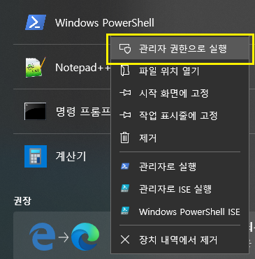 21. windows PowerShell을 프로그램 관리자 권한으로 실행한다.