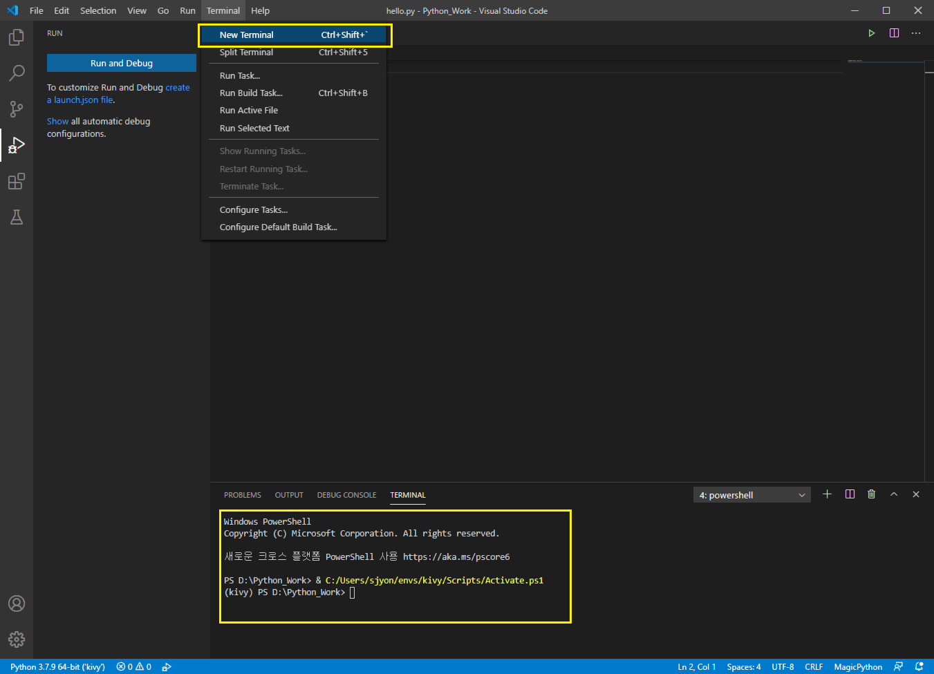 26. Terminal 메뉴에서 New Terminal 메뉴를 선택하여 커맨드 터미널을 실행한다. 커맨드 터미널이 실행되면서 가상 환경이 자동으로 활성화(activate) 된다.